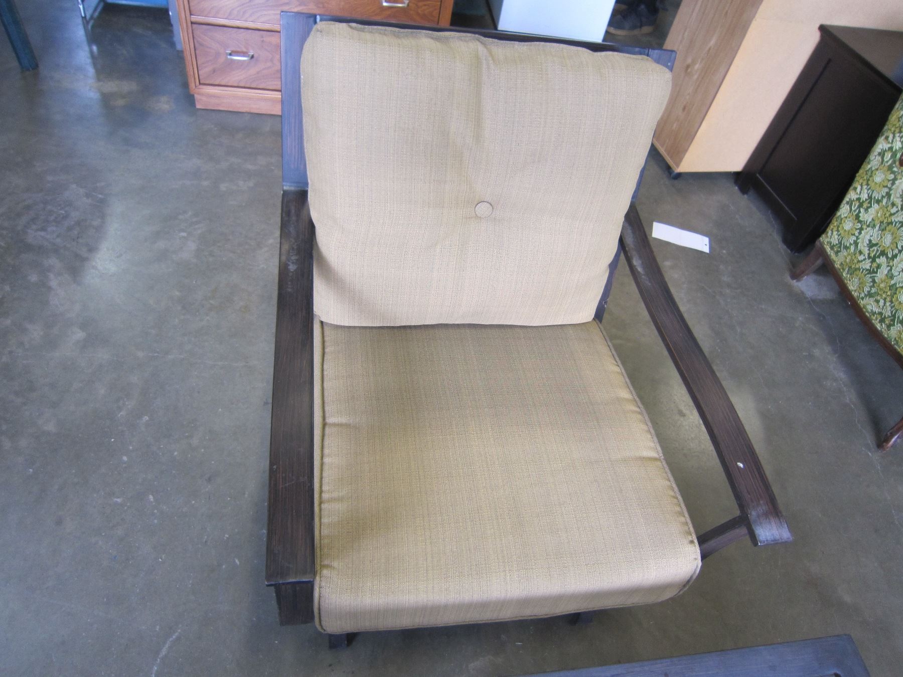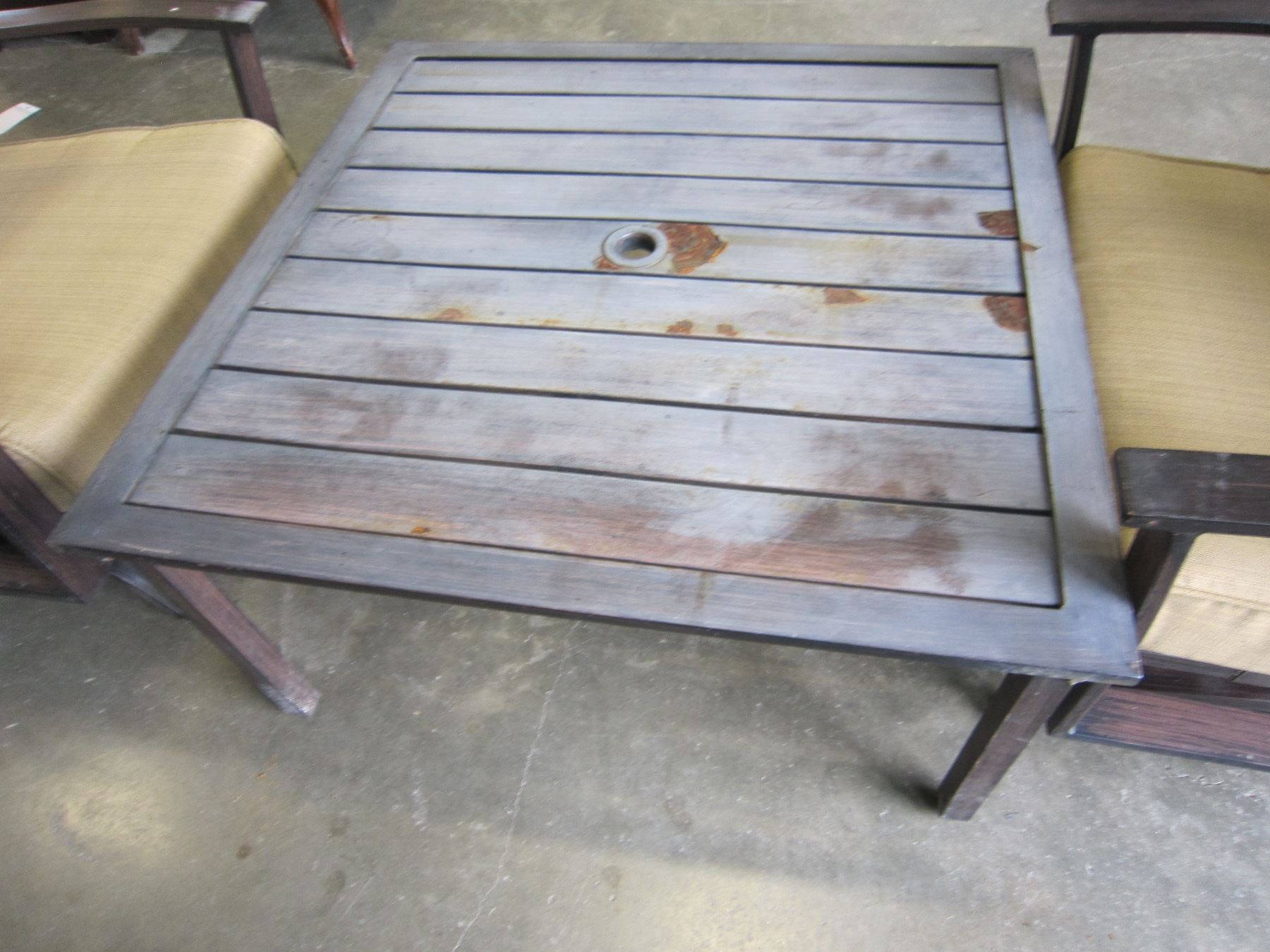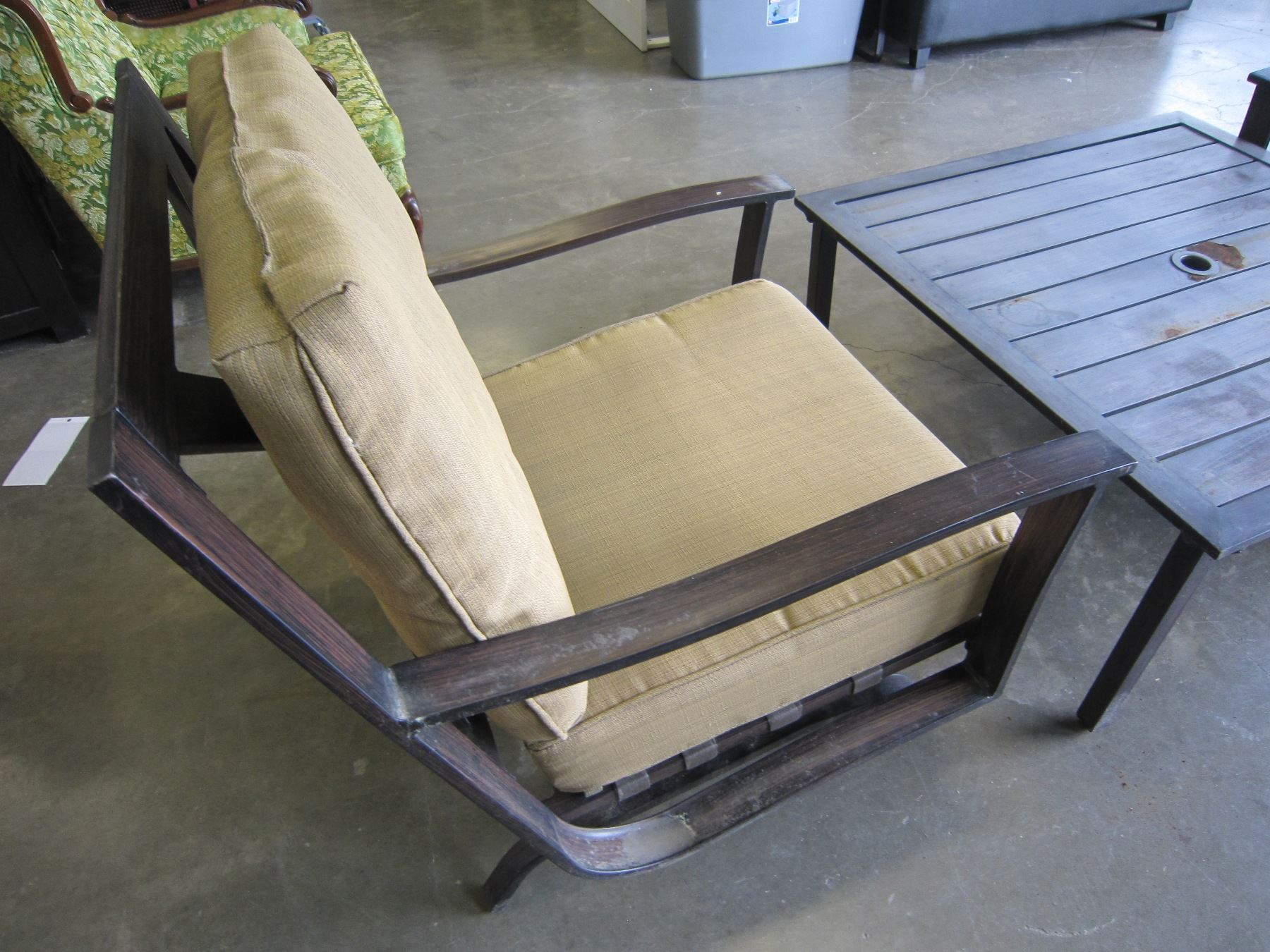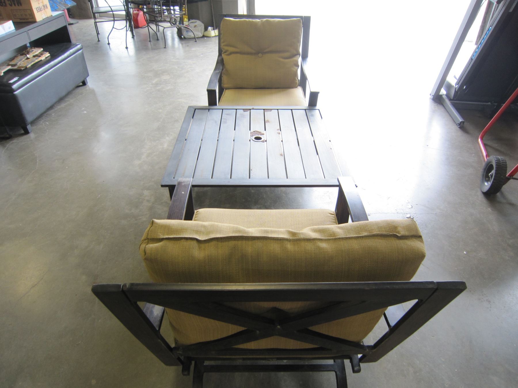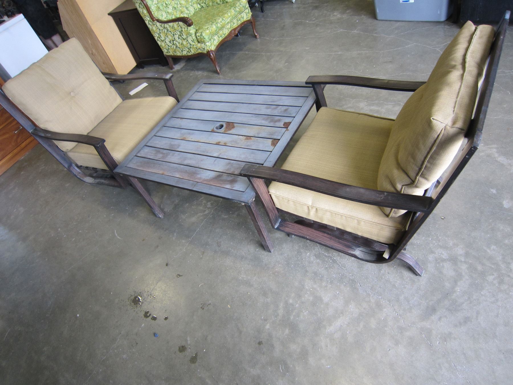 2 LOW ROCKING METAL PATIO CHAIRS AND METAL PATIO TABLE