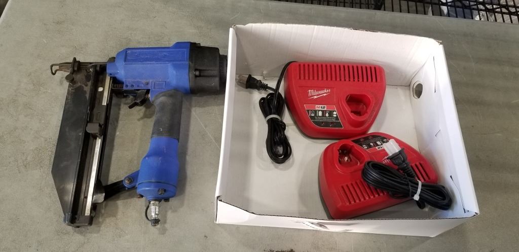 2 M12 MILWAUKEE BATTERY CHARGERS AND PNEUMATIC NAILER