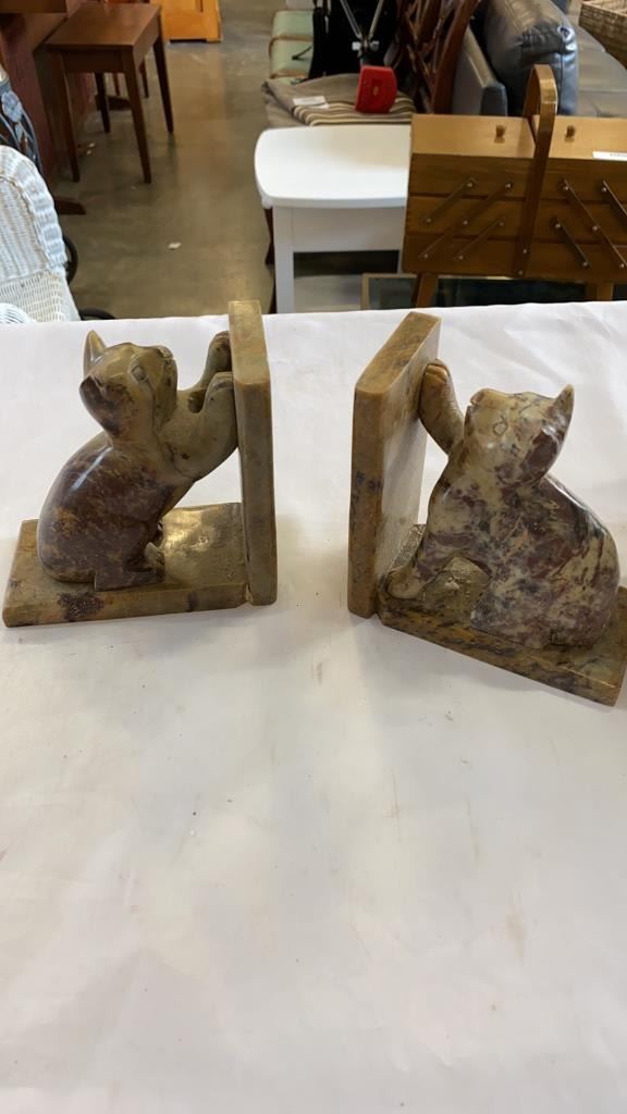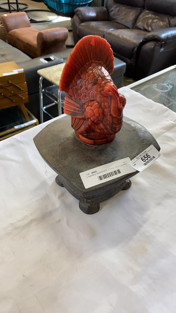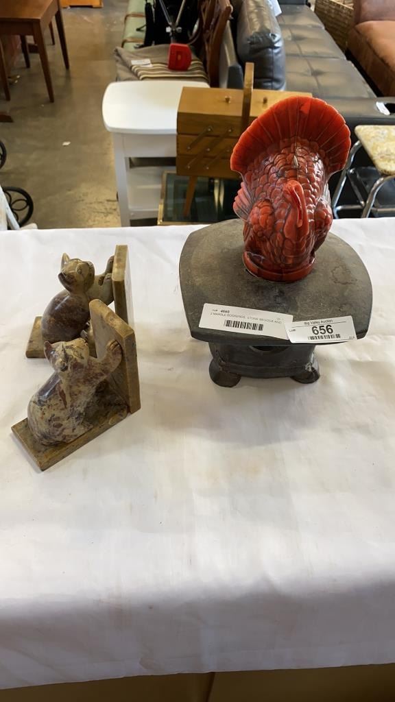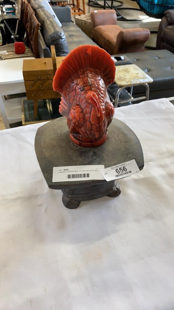 2 MARBLE BOOKENDS, STONE BEGODA AND TURKEY CANDLE