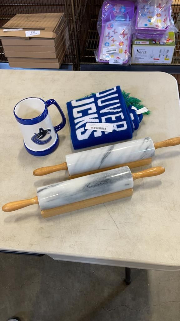 2 MARBLE ROLLING PINS, WITH CANUCKS COLLECTIBLES
