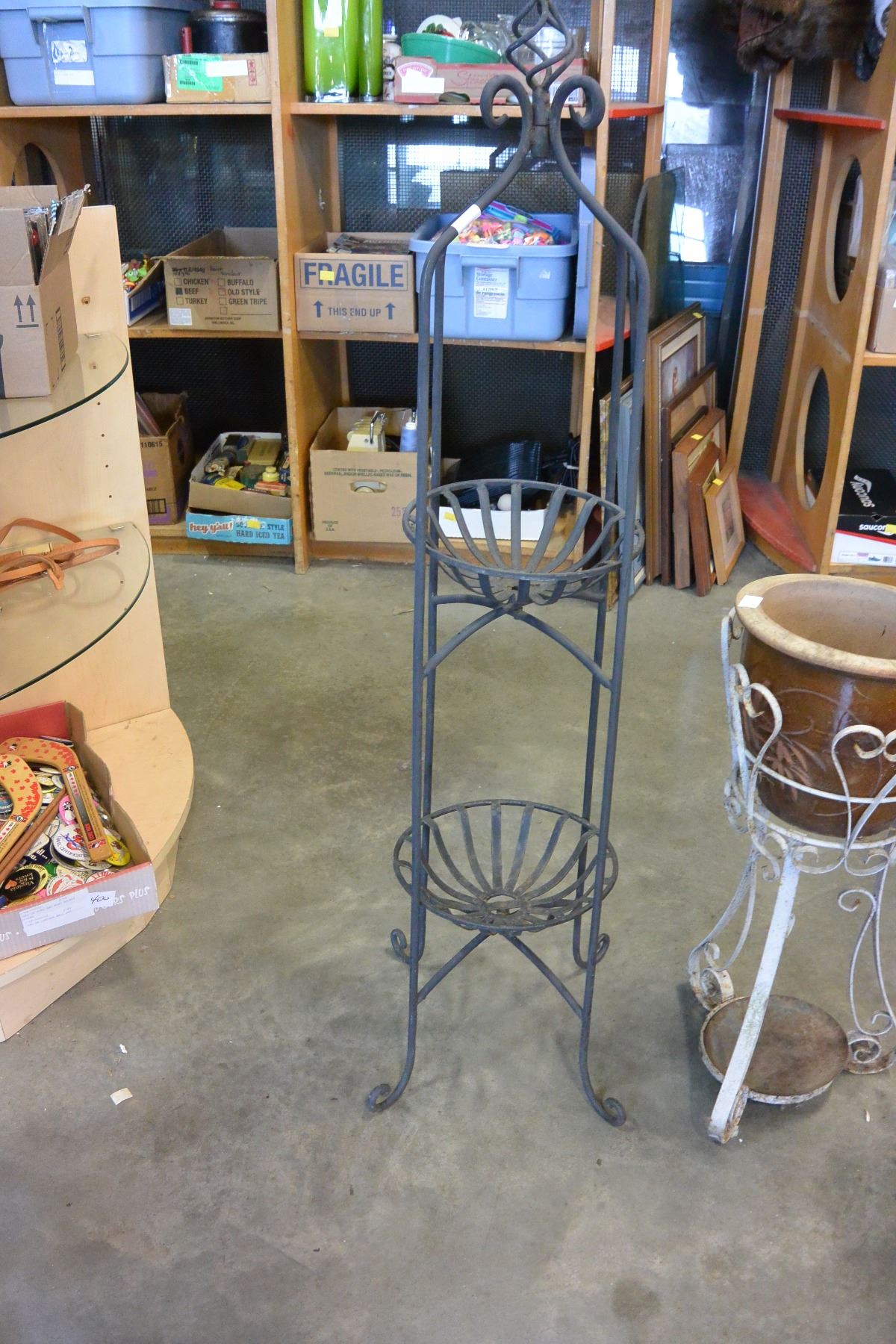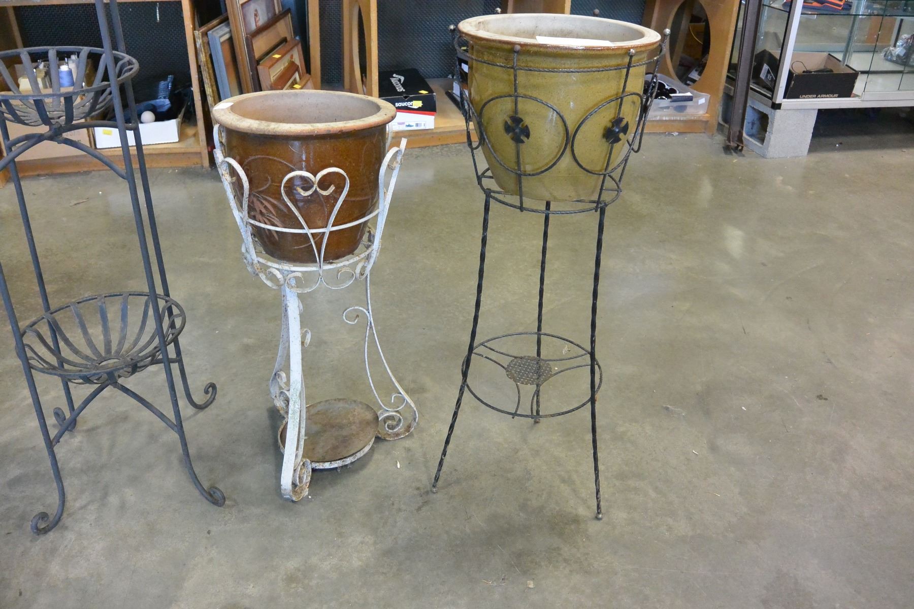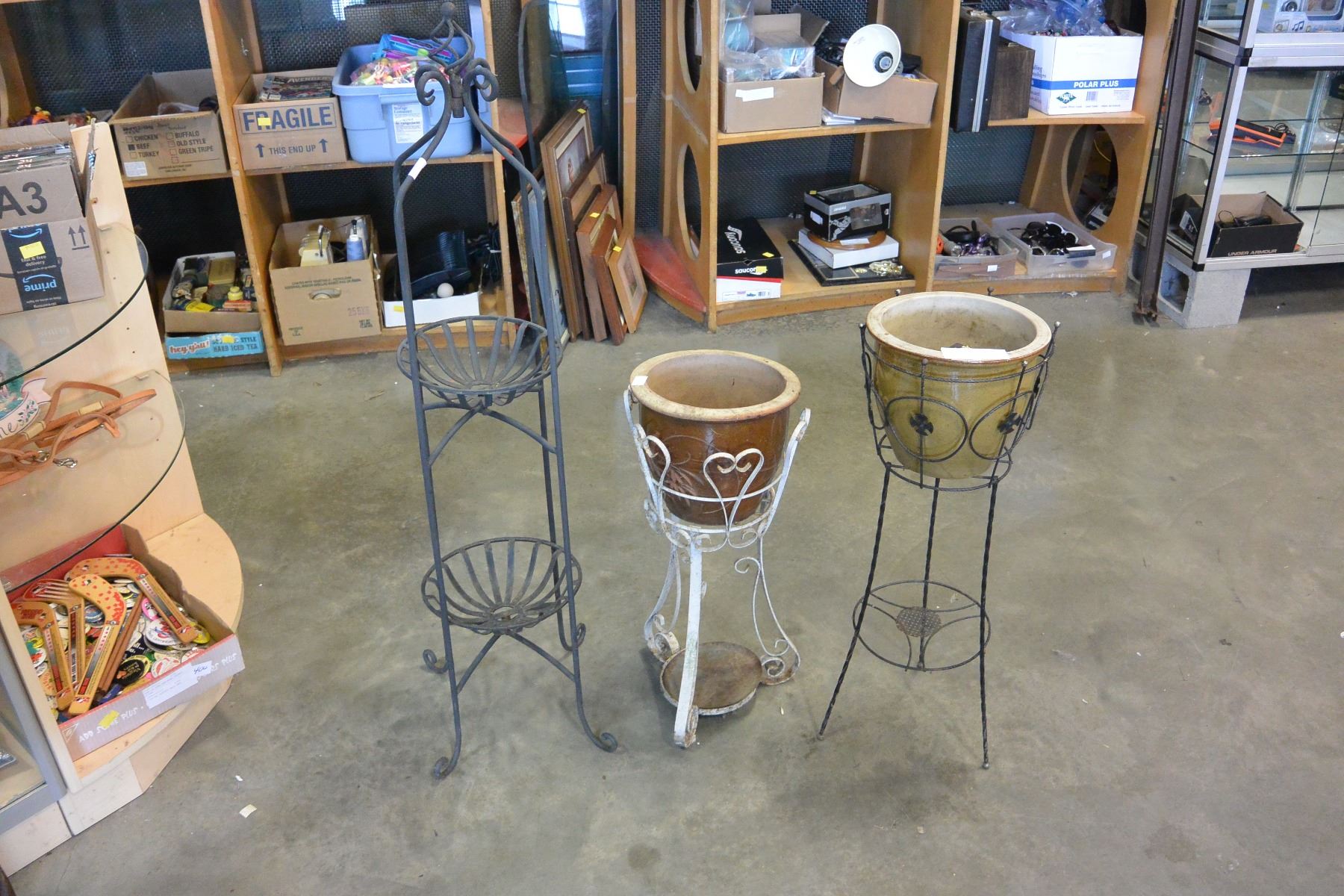 2 METAL PLANTER STANDS W/ POTS AND METAL DOUBLE PLANTER STAND