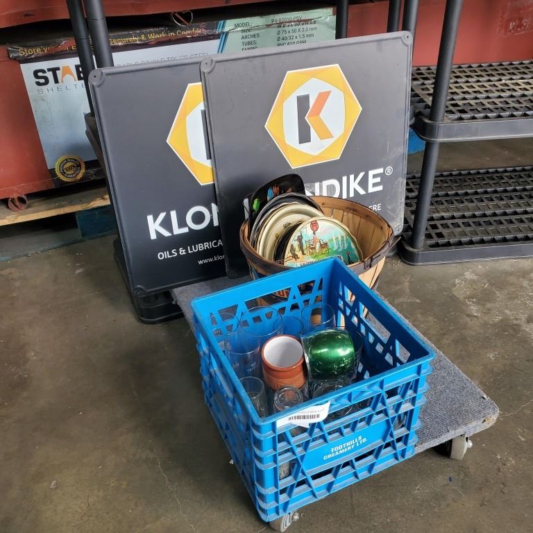 2 METAL SIGNS, BUCKET OF METAL PLATES AND CRATE OF BEER GLASSES