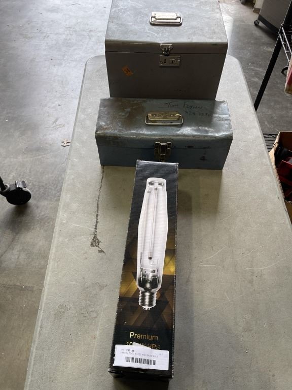 2 METAL TOOL BOXES AND GROW BULB