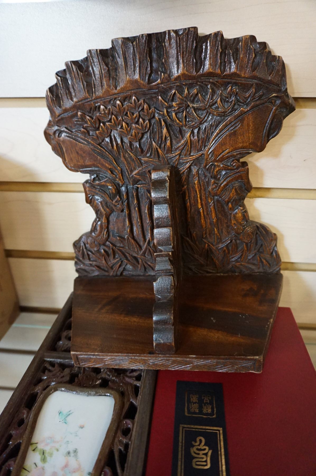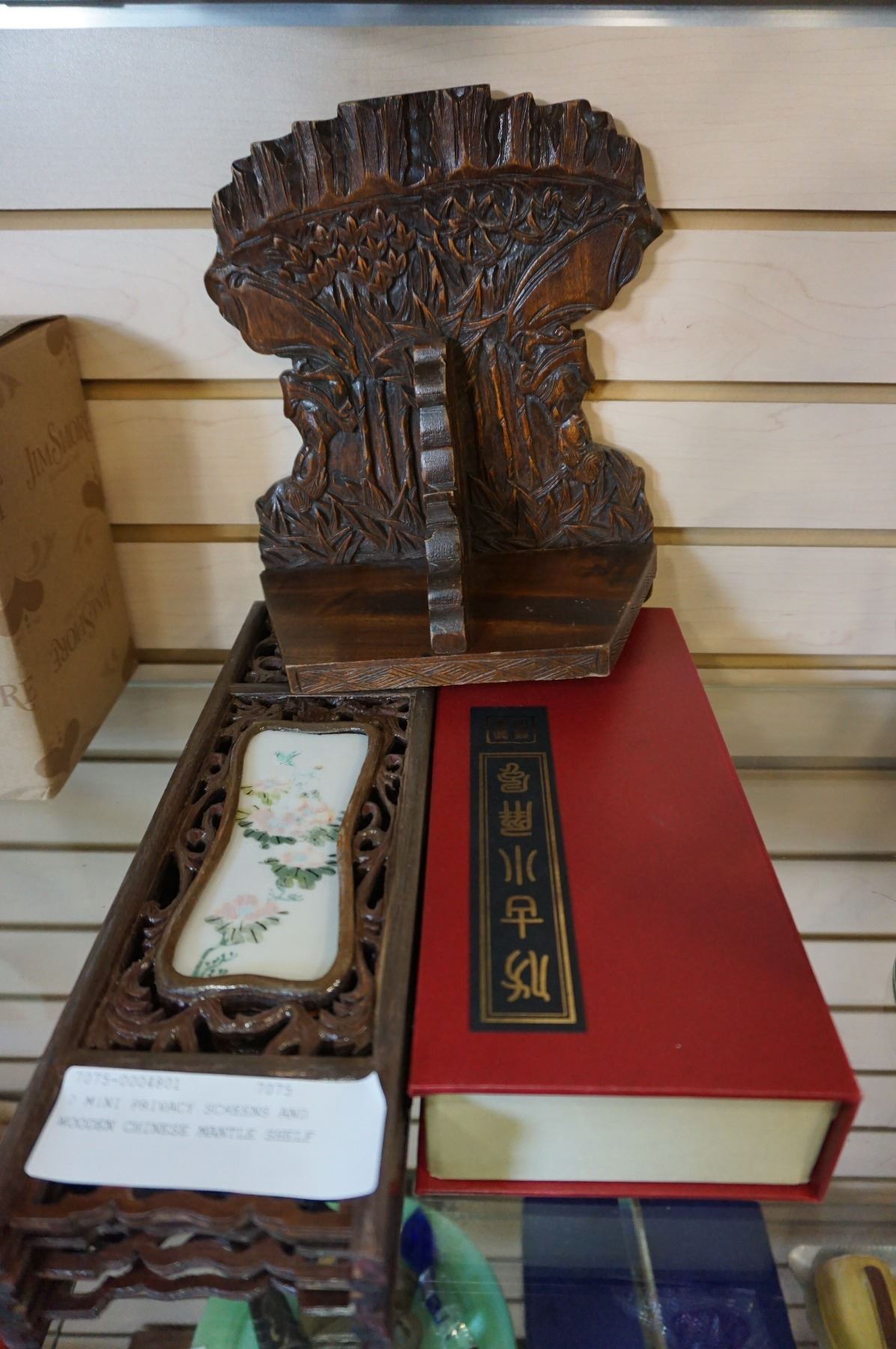2 MINI PRIVACY SCREENS AND WOODEN CHINESE MANTLE SHELF
