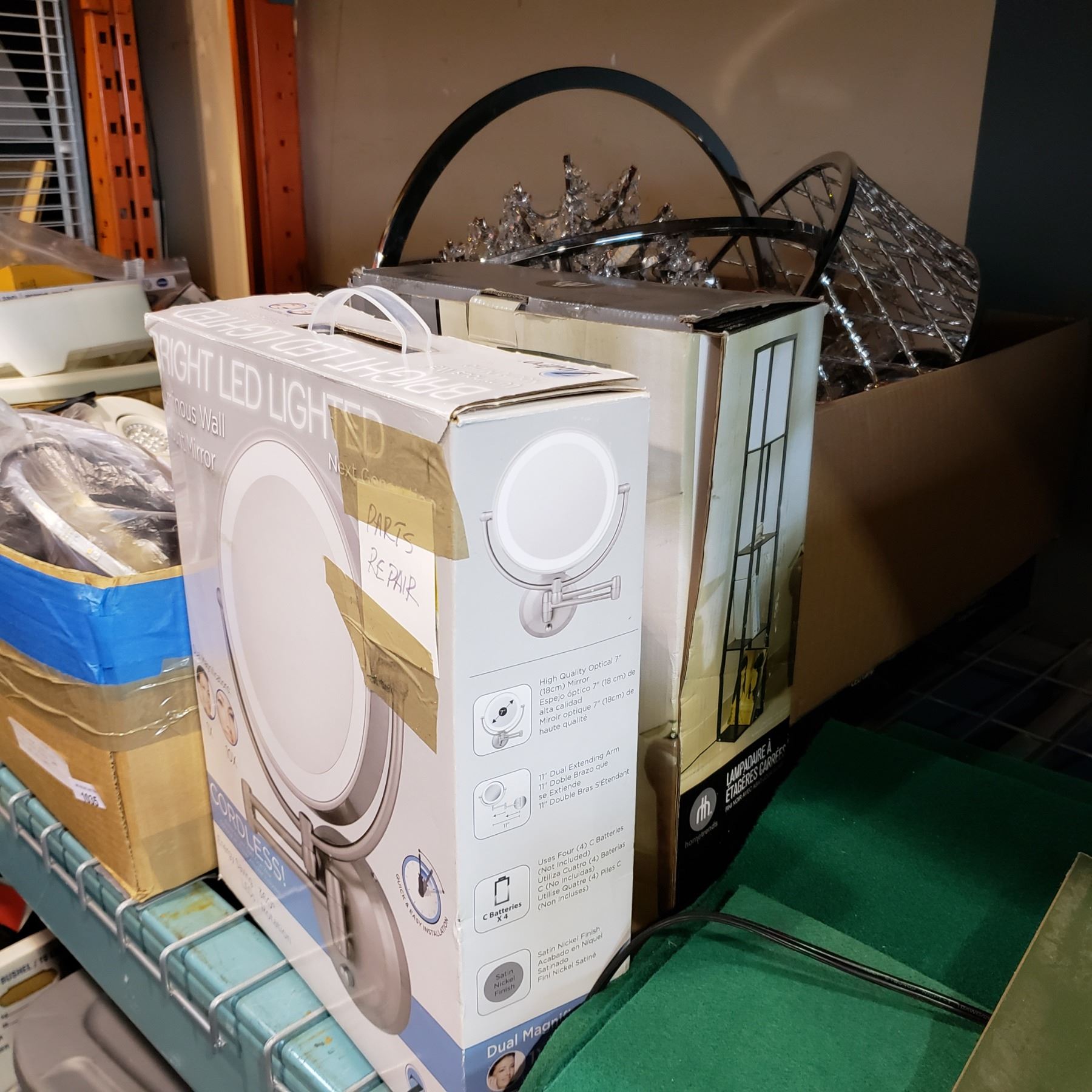 2 MODERN CHROME CHANDELIERS, LED WALL MOUNT MIRROR, LAMP SHELF, AND LED LIGHTS