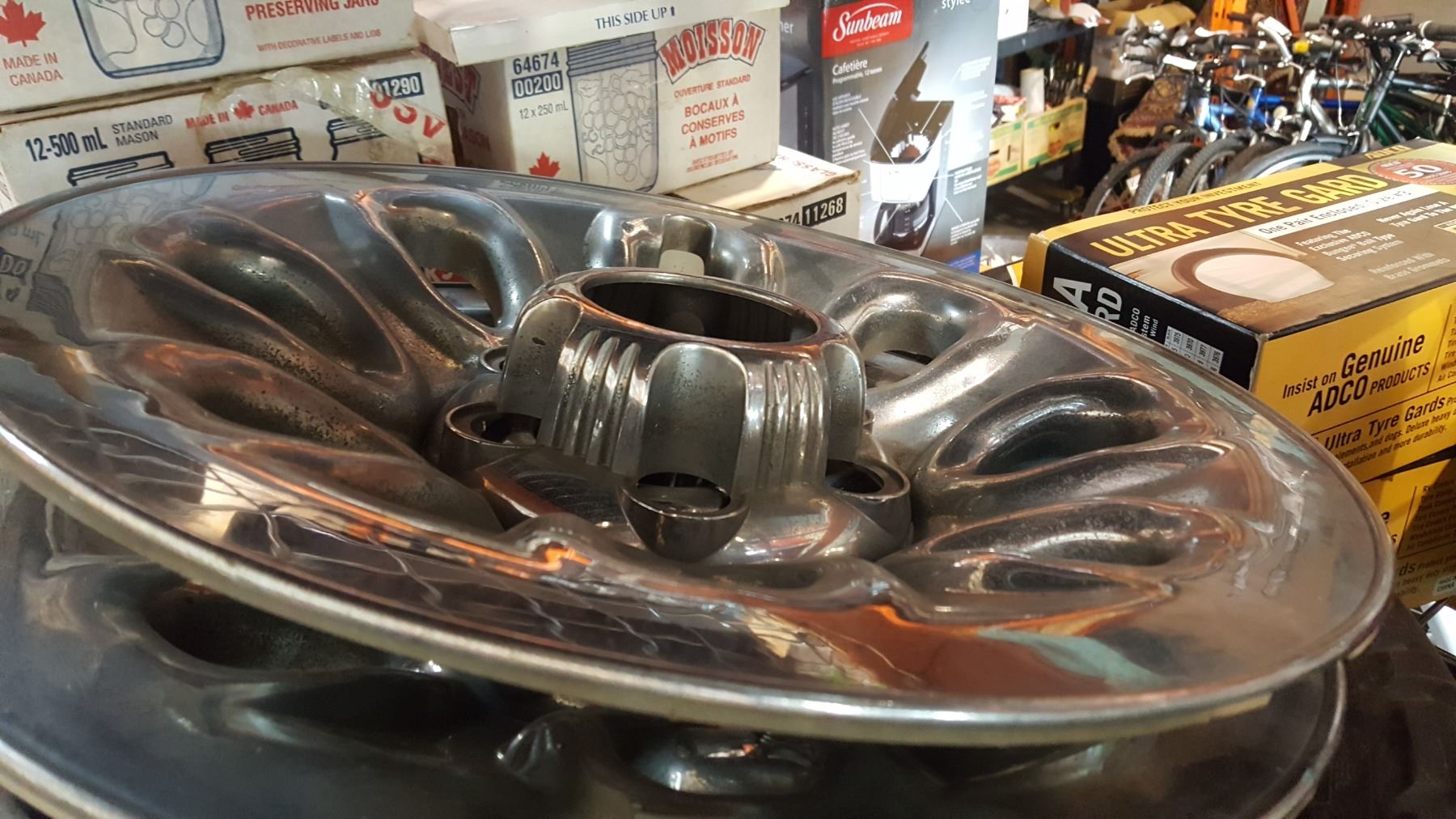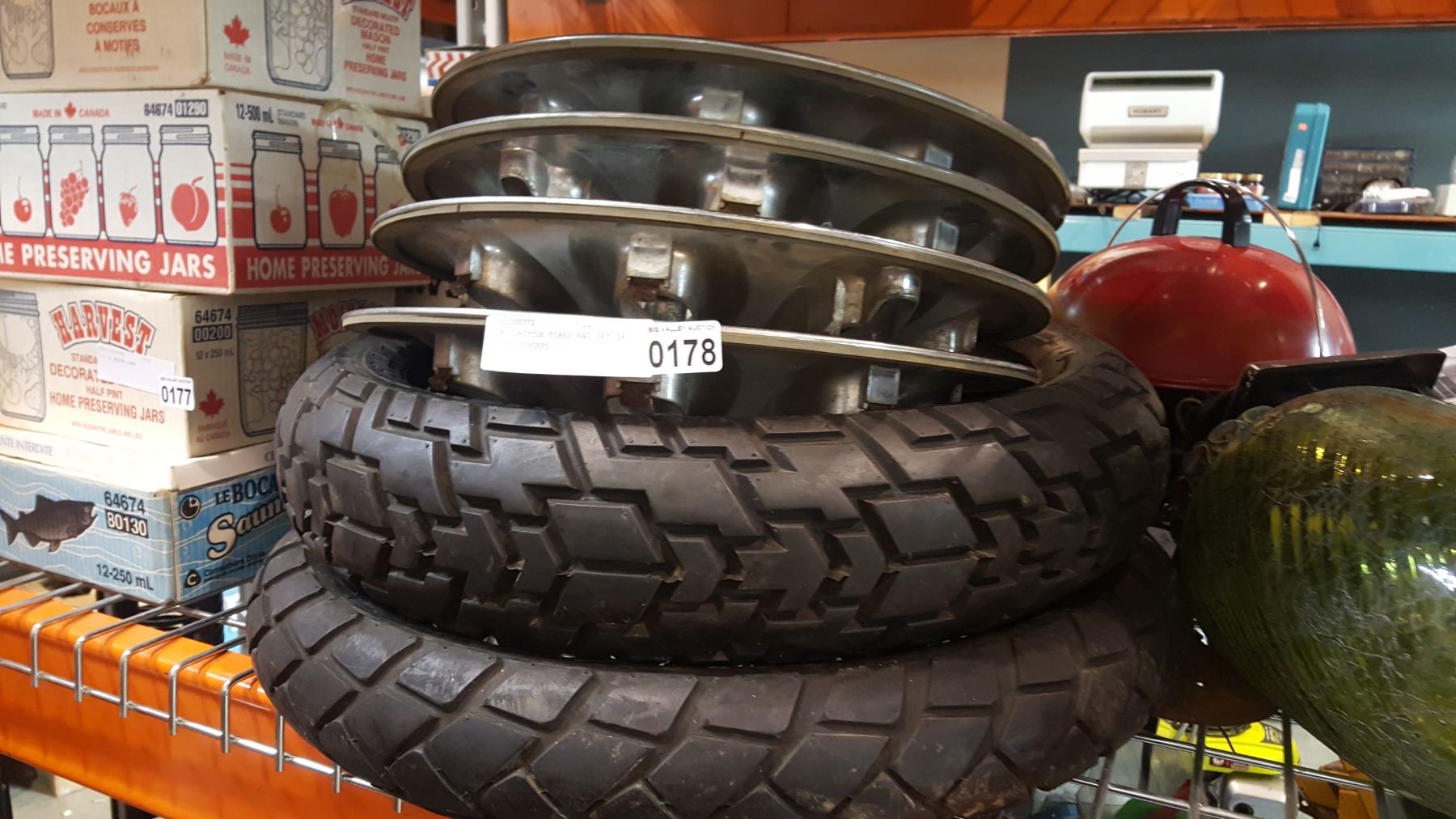 2 MOTORCYCLE TIRES AND SET OF TRUCK HUBCAPS