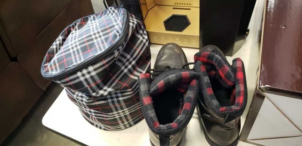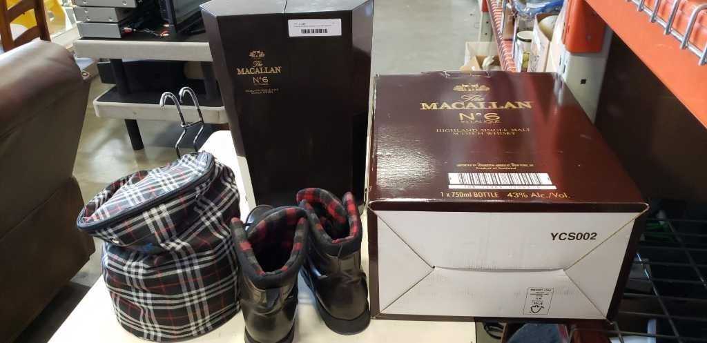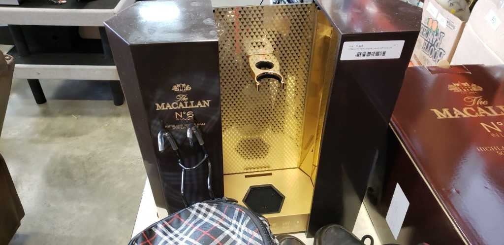 2 Macallan liquor display cases with hook on travel basket and boots