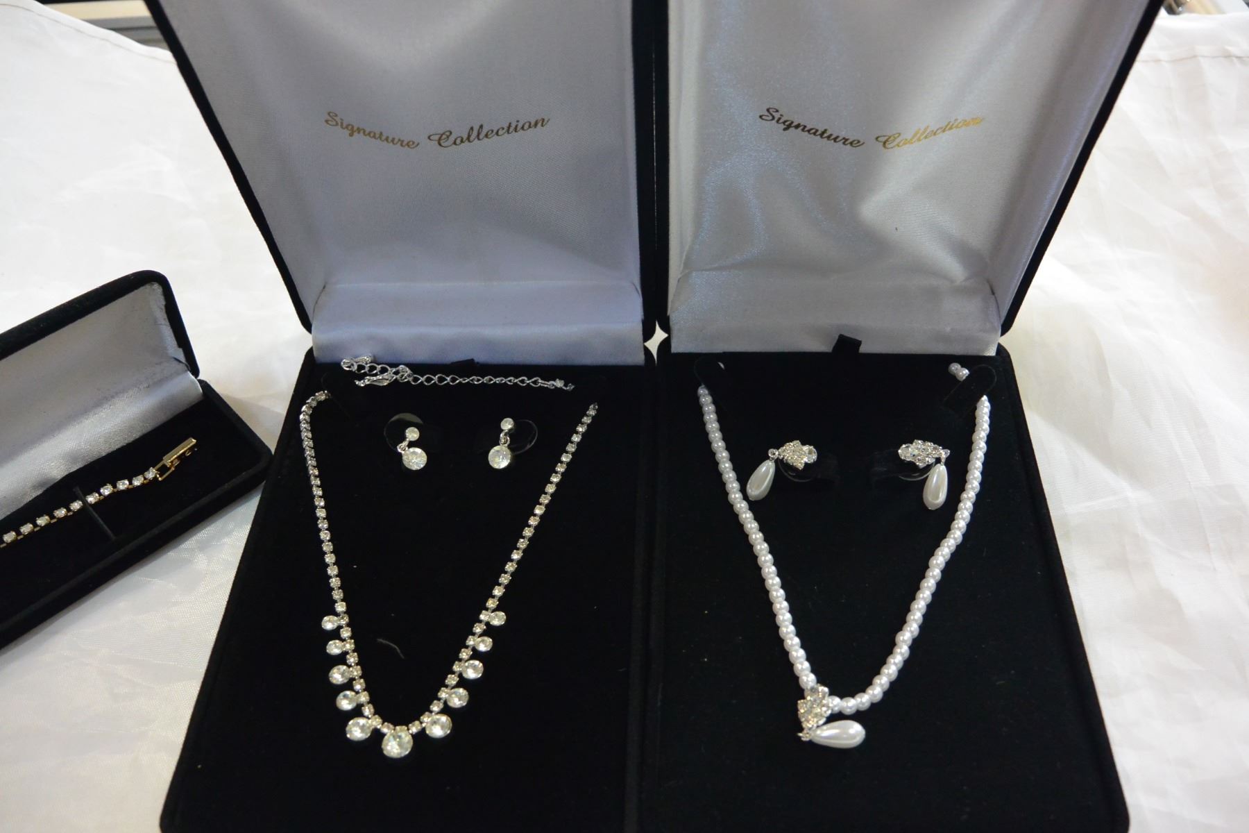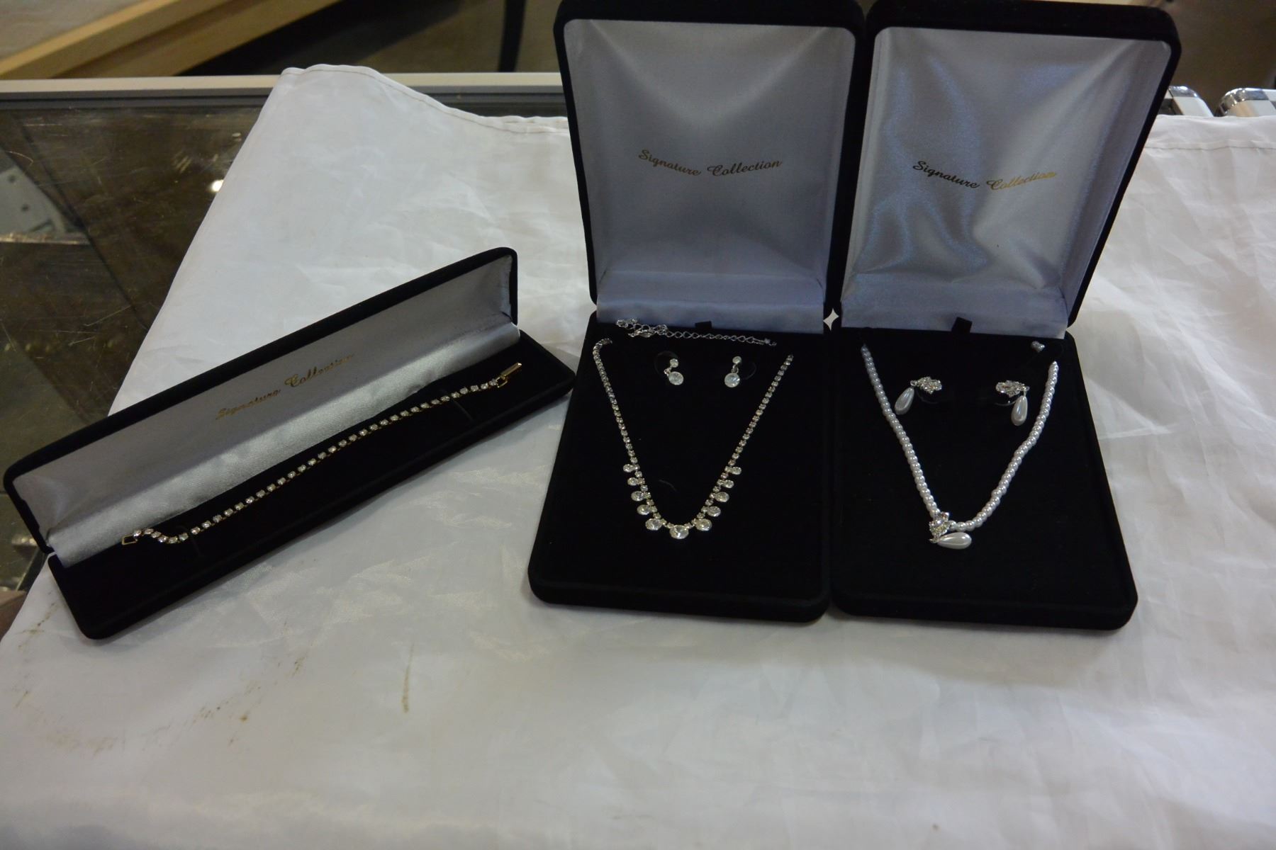 2 NECKLACE AND EARRING SETS, AND TENNIS BRACELET IN GIFT BOXES