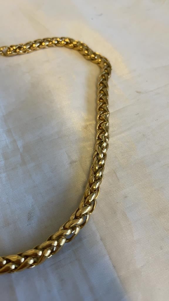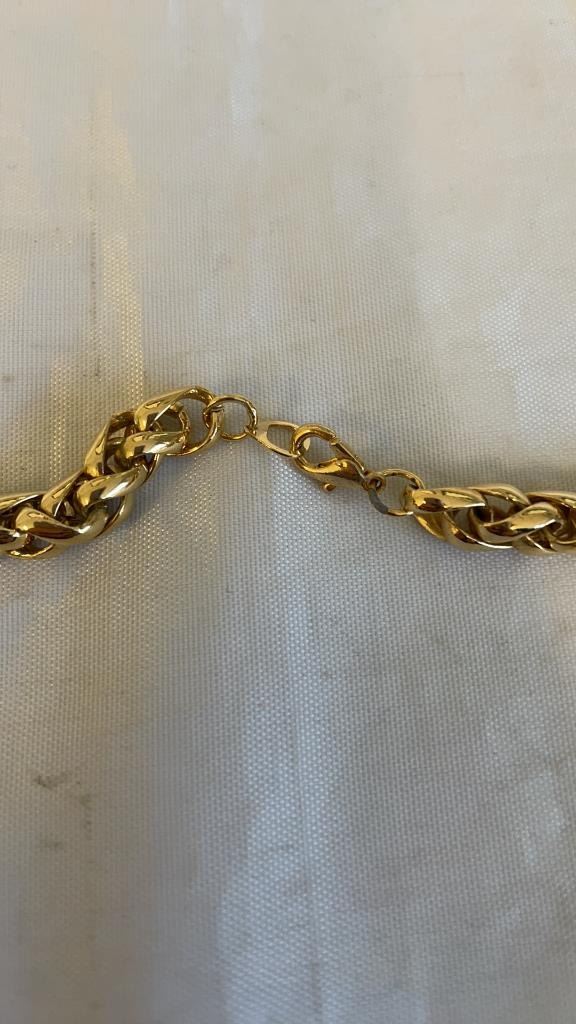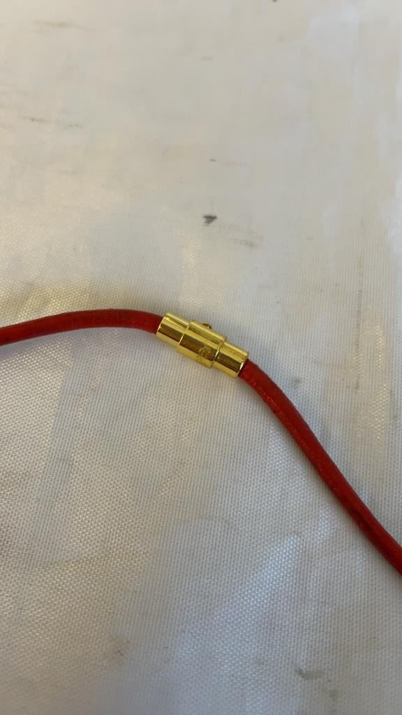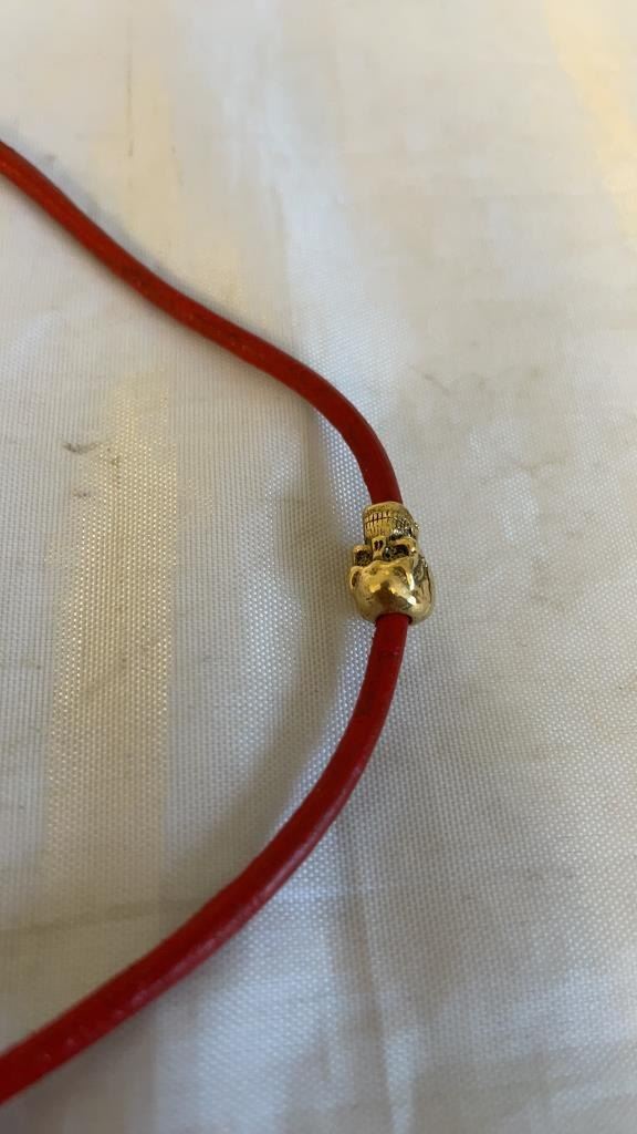 2 NECKLACES - GOLD PLATED CHAIN MARKED 14K, AND RED CORD CHOKER WITH SKULL BEADS