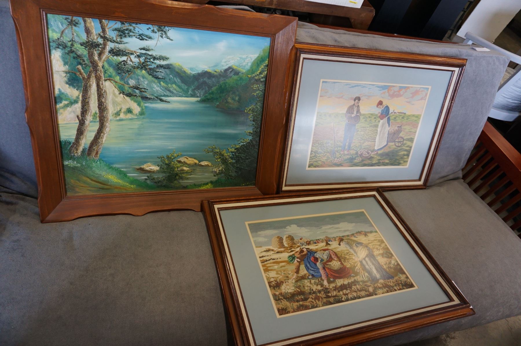 2 NEEDLE POINT PICTURES AND OIL PAINTING