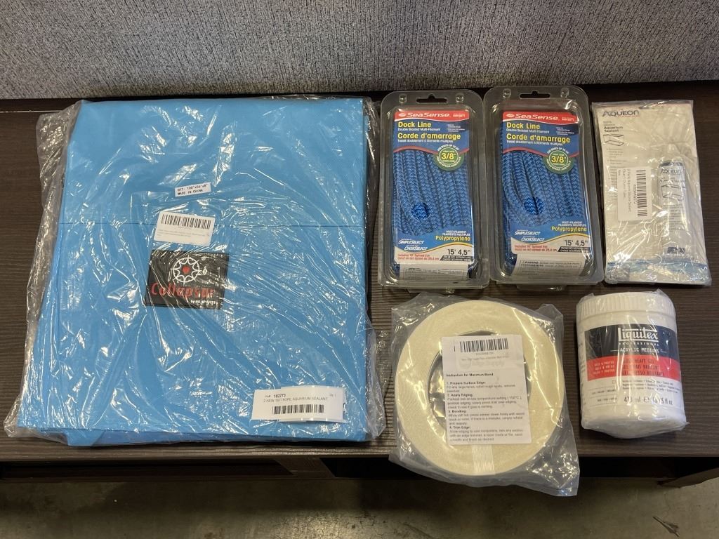 2 NEW 15FT ROPE, AQUARIUM SEALANT, ROLL OF PVC PEEL AND STICK BANDING, AND GLOSS HEAVY GEL, AND NEO