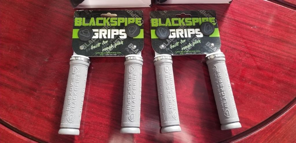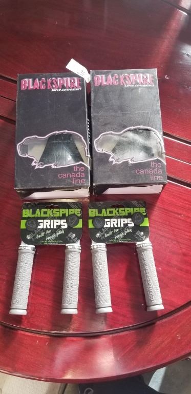 2 NEW BLACKSPIRE BIKE SEATS AND 2 SETS OF BLACKSPIRE GRIPS