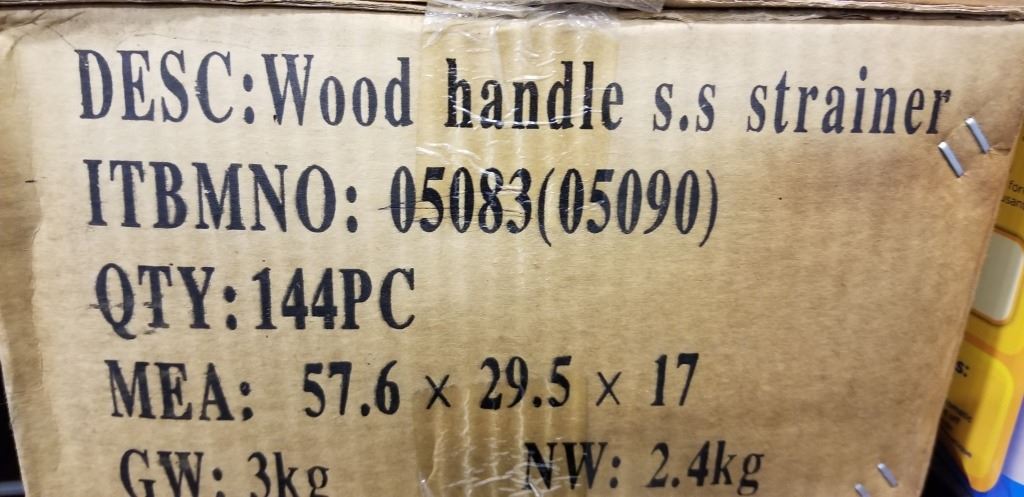 2 NEW CASES OF STAINLESS STRAINERS WITH WOODEN HANDLES