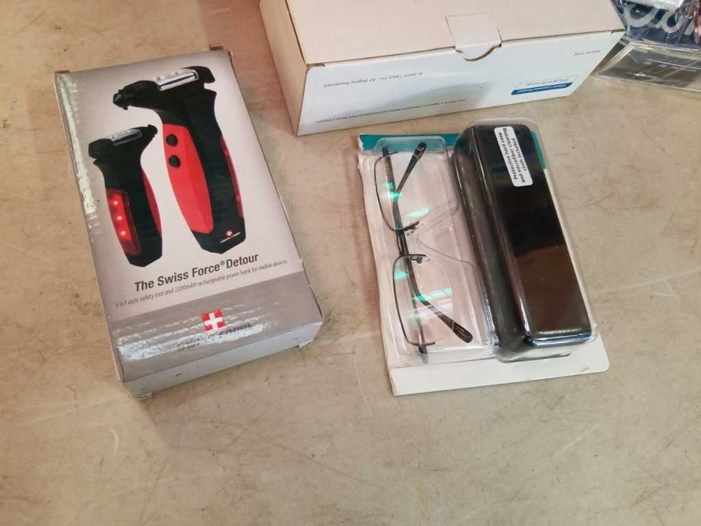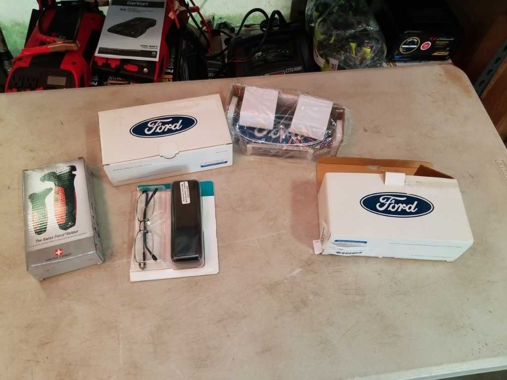2 NEW FORD CLOCKS, SWISS FORCE DETOUR VEHICLE ESCAPE TOOL AND READING GLASSES