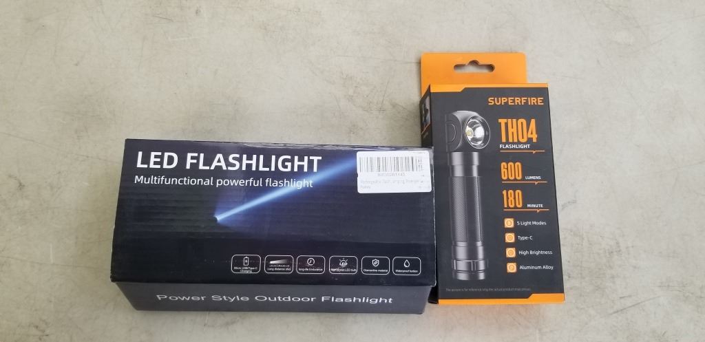 2 NEW LED FLASHLIGHTS - 1 SUPERFIRE TH04 600 LUMEN LED FLASHLIGHT, WITH 5 LIGHT MODES, TYPE C CHARGE RECHAERGABLE BATTERY, 180 MINUTE LIFE, TAIL MAGNET AND 1 LED FLASHLIGHT RECHARGEABLE WITH WORKLIGHT 6 IN 1 LIGHT MODES, INCLUDES BATTERY AND CHARGE, AND TAIL MAGNET RETAIL $40 EACH