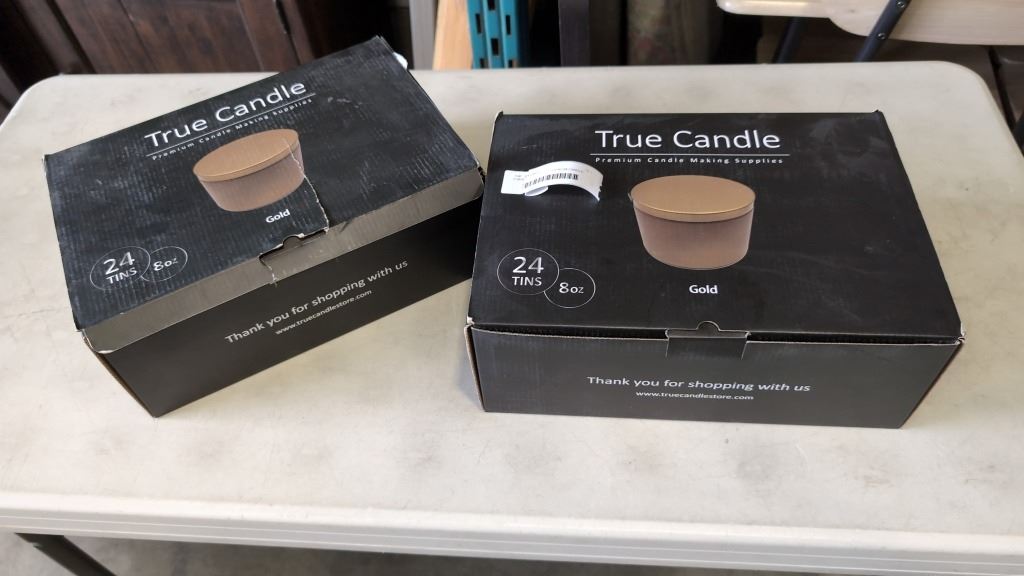 2 NEW TRUE CANDLE PREMIUM CANDLE MAKING SUPPLIES BOXES OF 24 8OZ TINS, GOLD COLOR