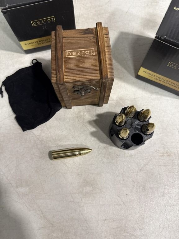 2 NEW WHISKEY BULLET STONE GIFT SETS IN WOODEN BOX WITH VELEVET BAG, 6 BULLET STONES PER SET