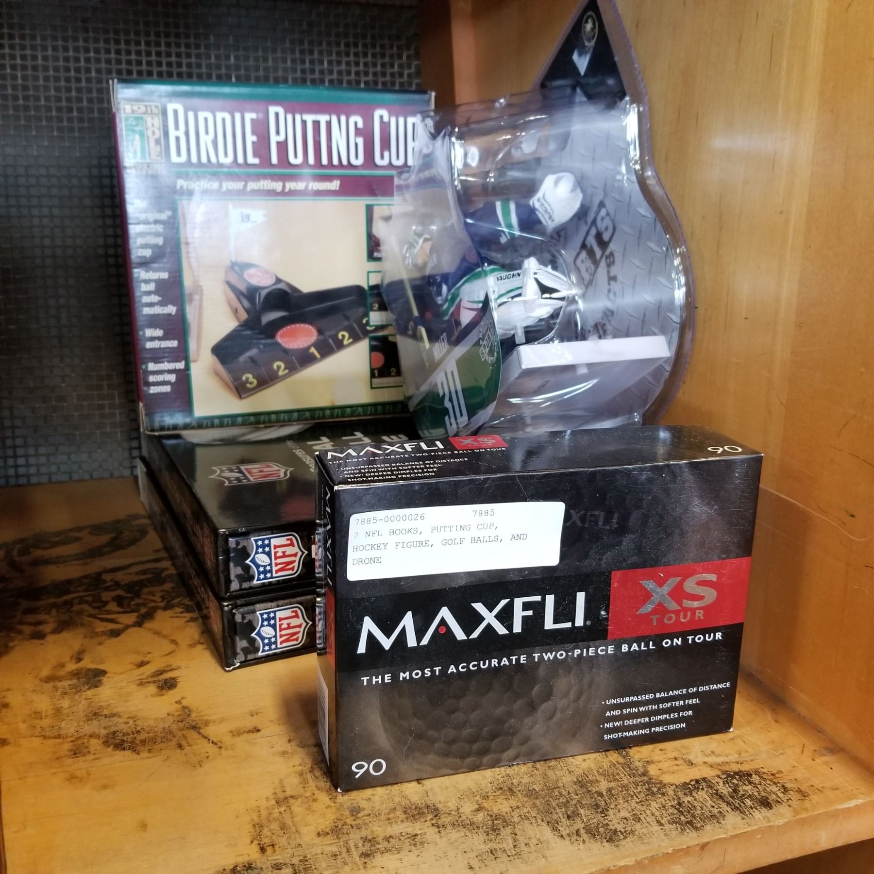 2 NFL BOOKS, PUTTING CUP, HOCKEY FIGURE, GOLF BALLS, AND DRONE