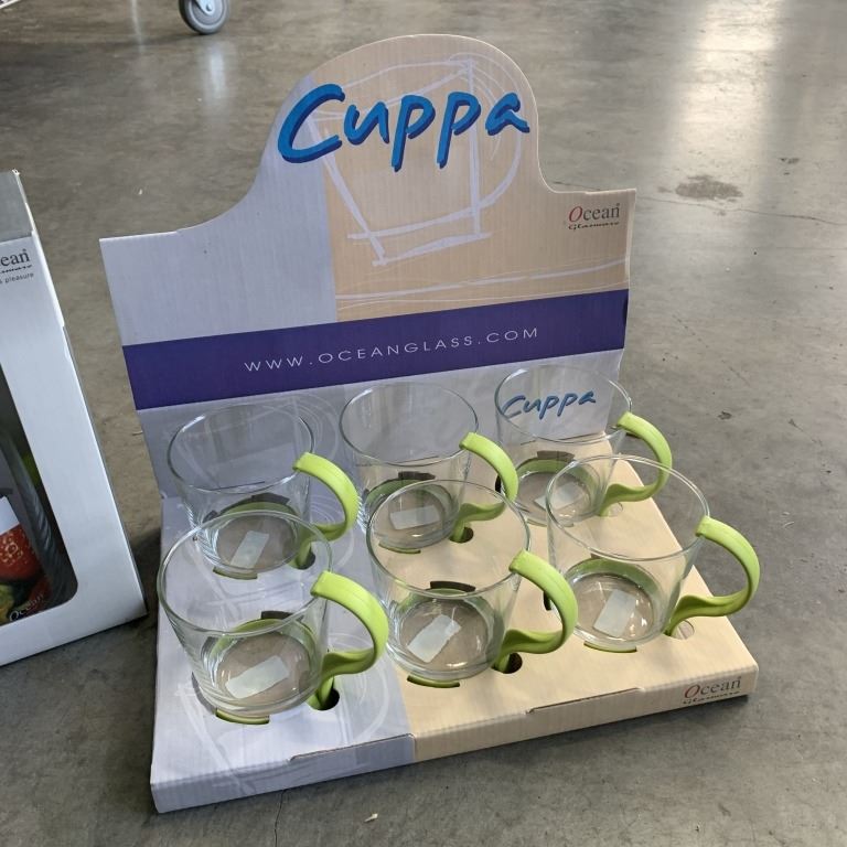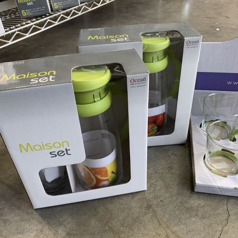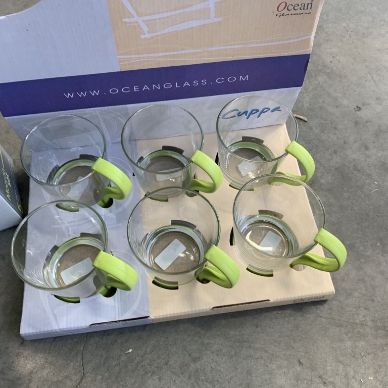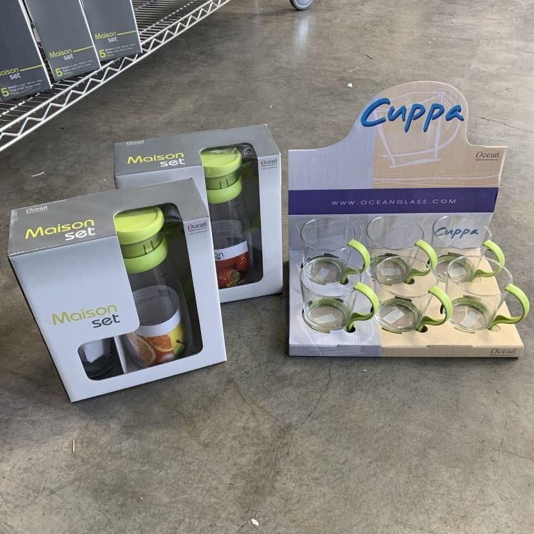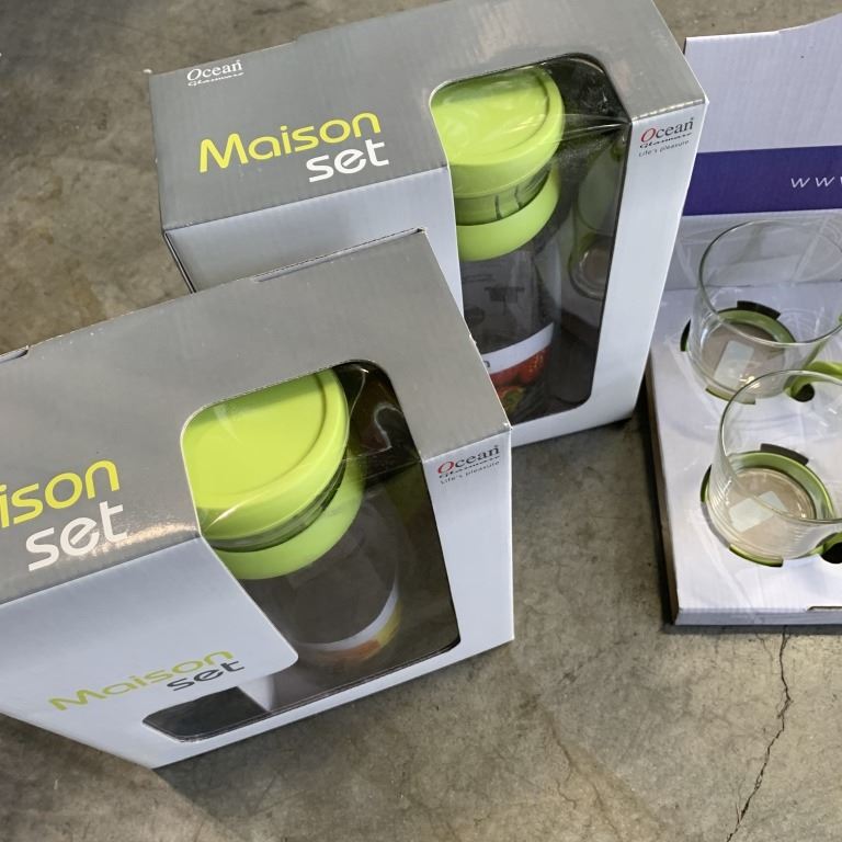 2 OCEAN GLASSWARE GREEN MAISON SET WITH GLASS PITCHER AND 4 GLASSES PLUS BOX OF EXTRA CUPS
