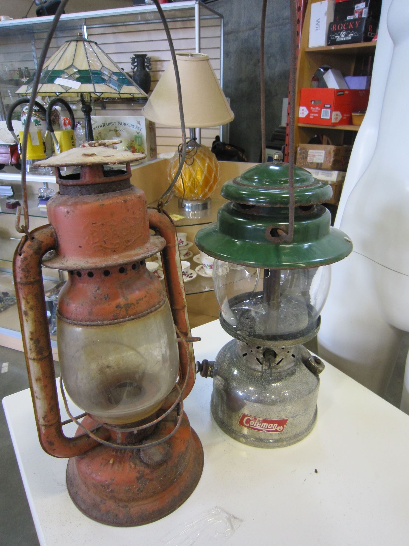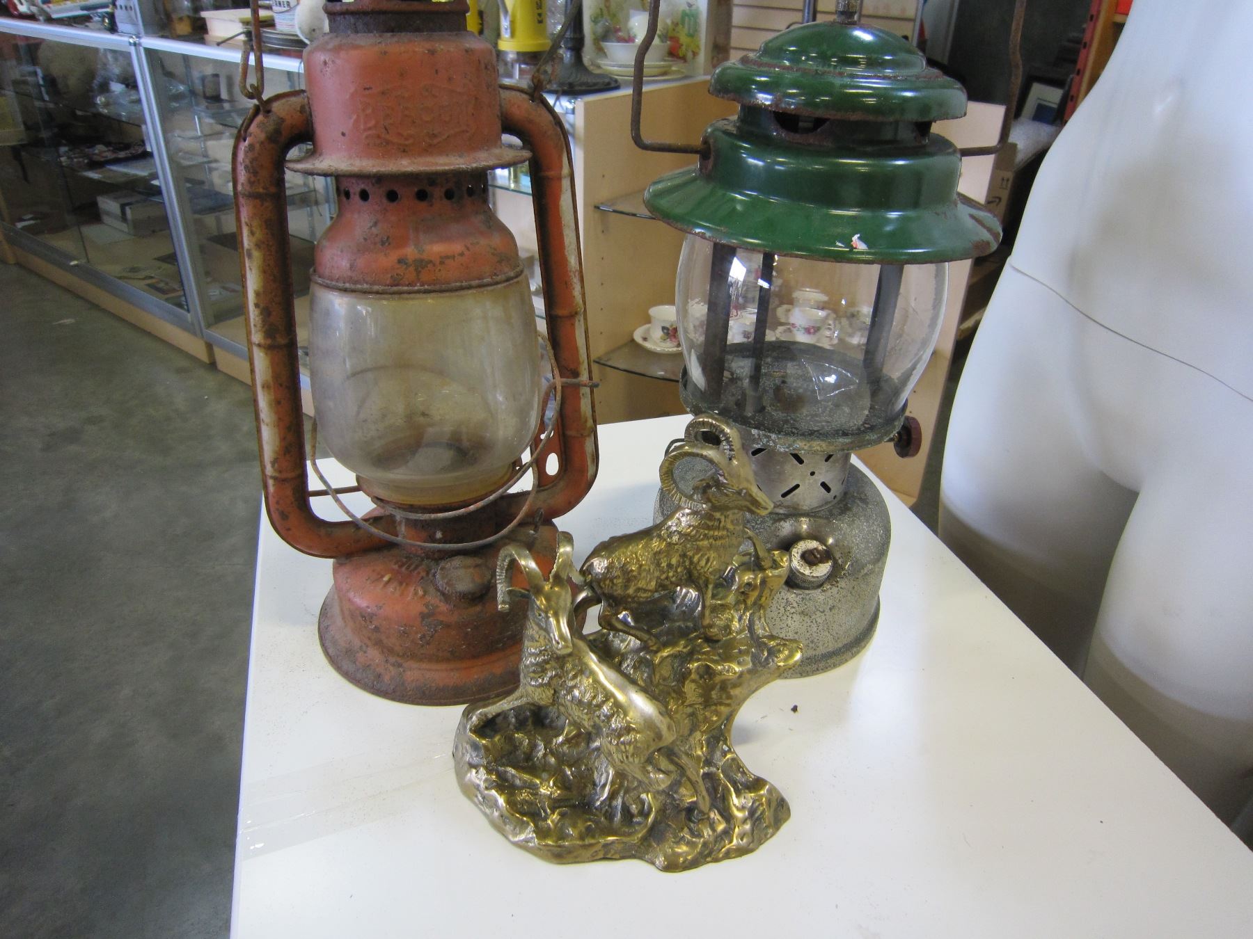 2 OIL LANTERNS AND METAL RAM FIGURE