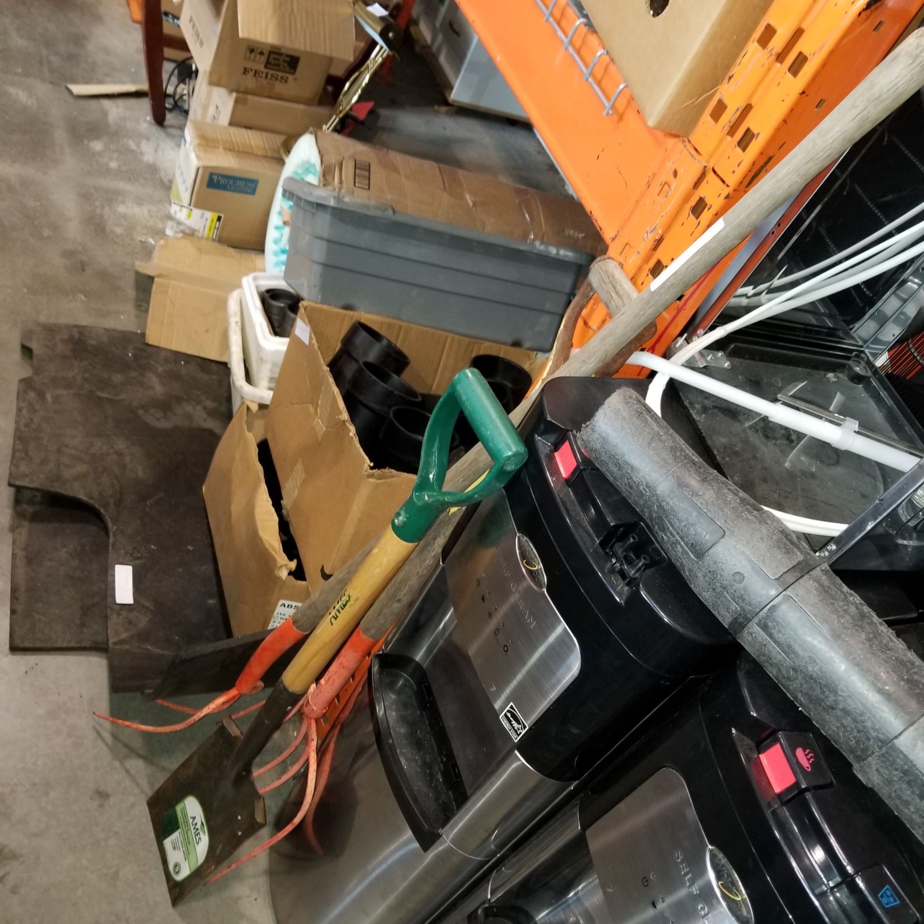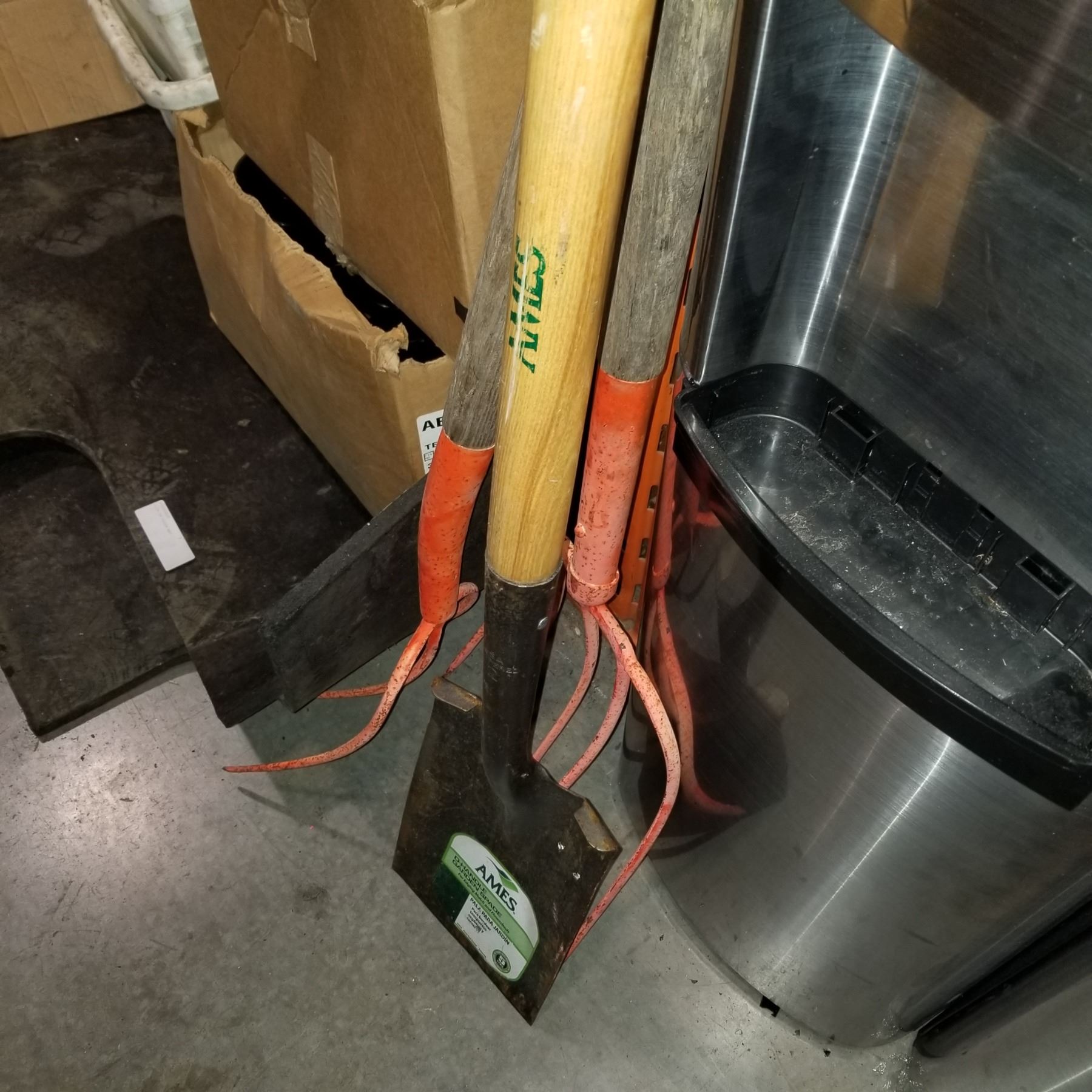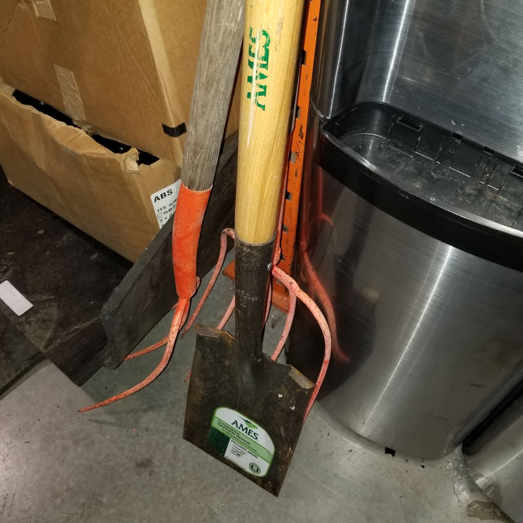 2 ORANGE PITCHFORKS AND GARDEN SPADE SHOVEL