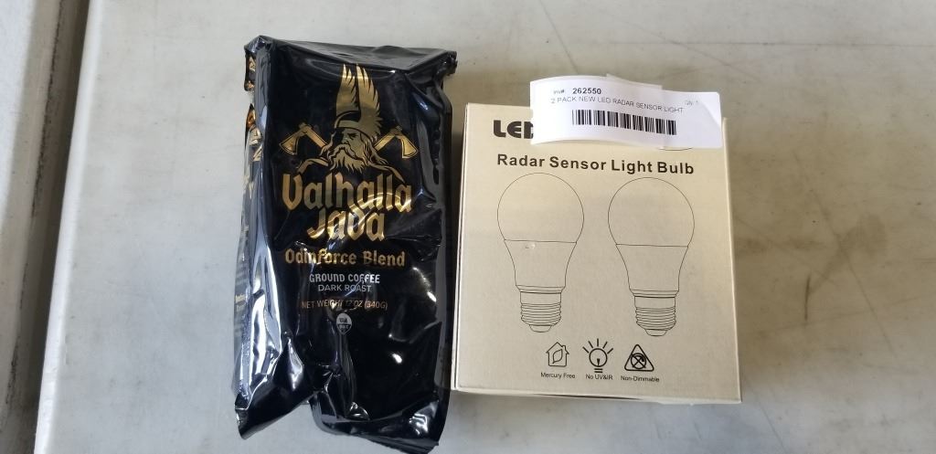 2 PACK NEW LED RADAR SENSOR LIGHT BULBS, AND VALHALLA JAVAODINFORCE BLEND DARK ROAST COFFEE