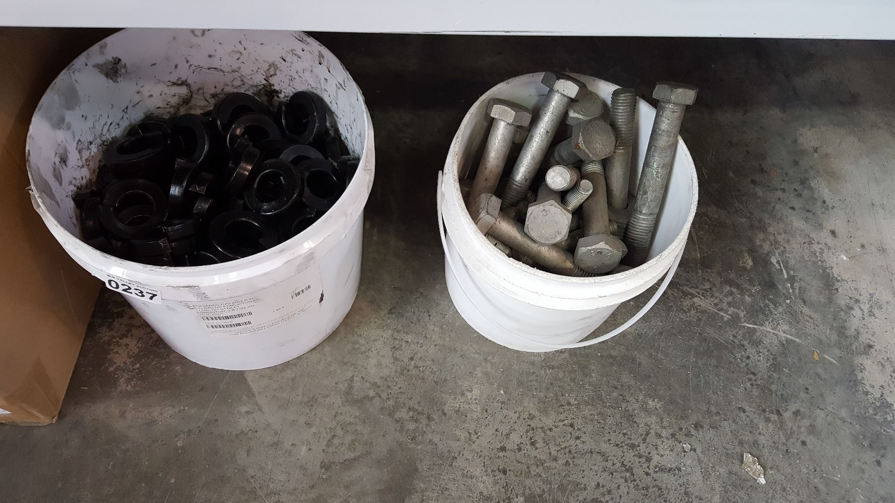 2 PAILS OF BOLTS SPRING WASHERS AND BOX OF WOOD KNOBS