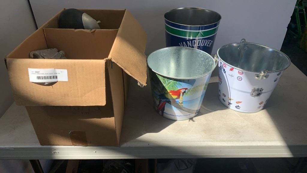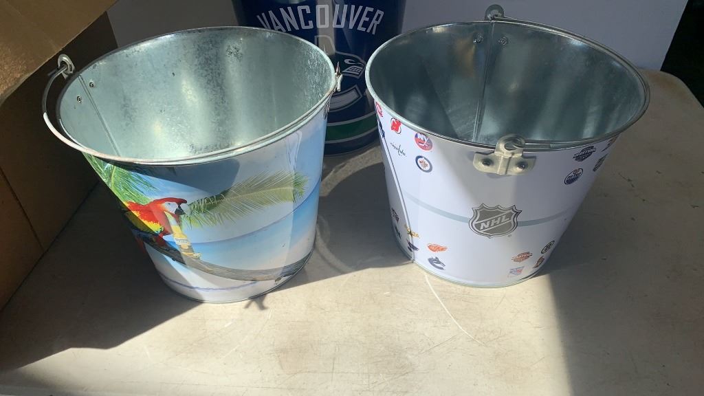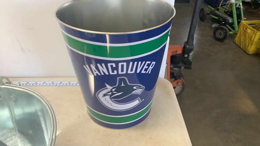 2 PAINT SPRAYERS, BIKE SEAT, 3 METAL PAILS - CORONA, CANUCKS, HOCKEY