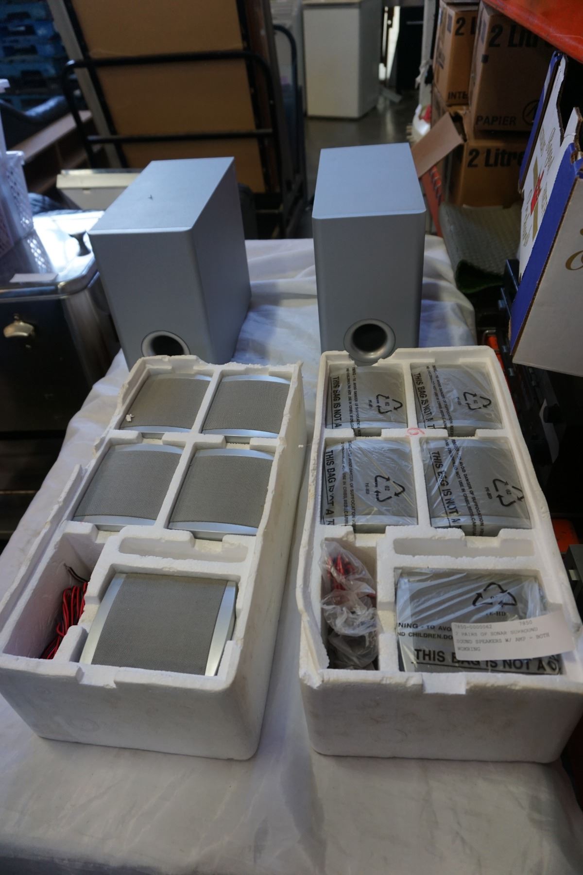 2 PAIRS OF SONAR SURROUND SOUND SPEAKERS W/ AMP - BOTH WOKRING
