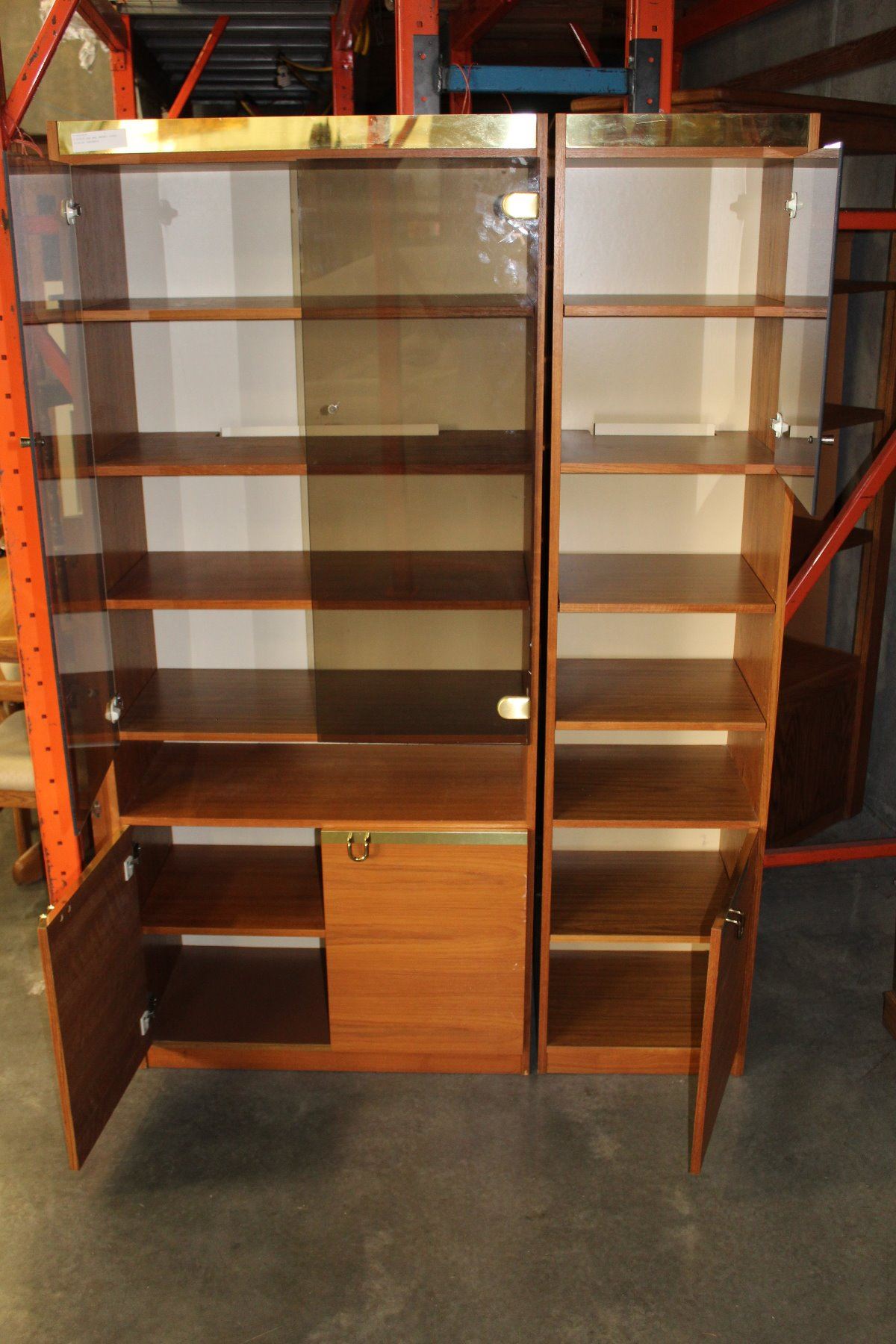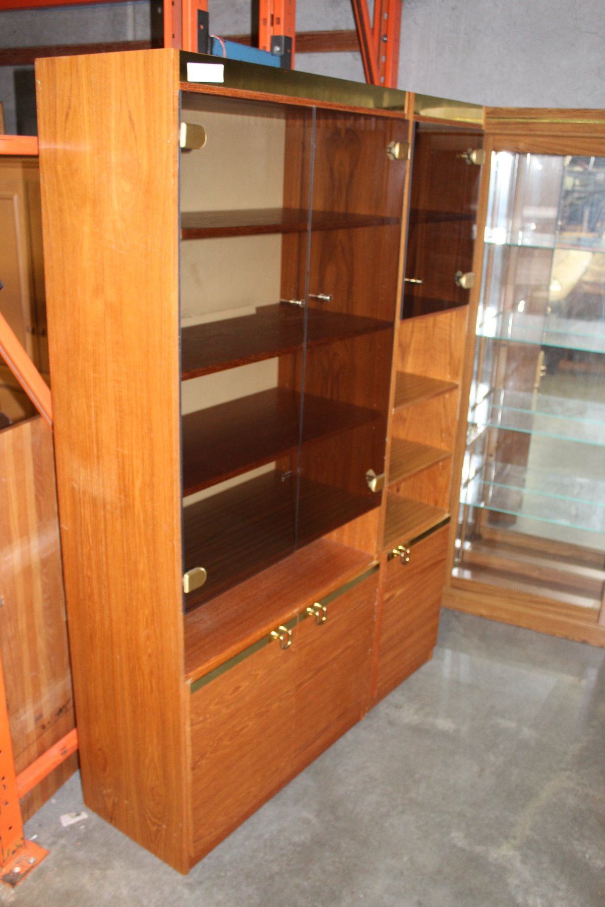 2-PIECE OAK AND SMOKED GLASS DISPLAY CABINETS