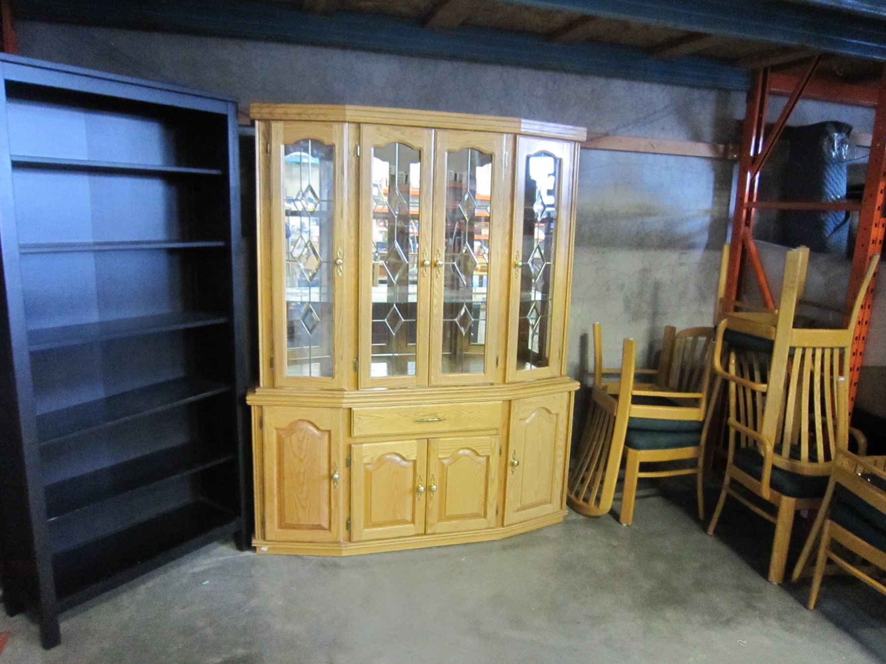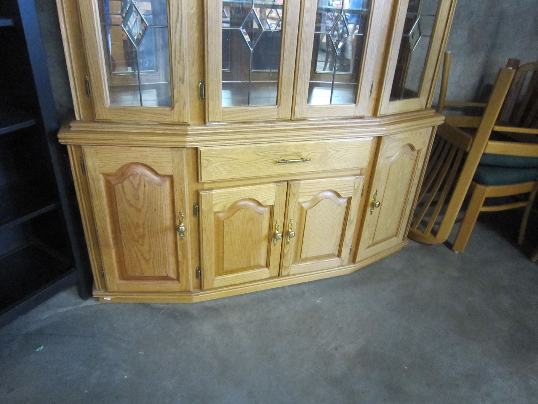 2 PIECE OAK DISPLAY CABINET W/ BEVELLED GLASS PANELS