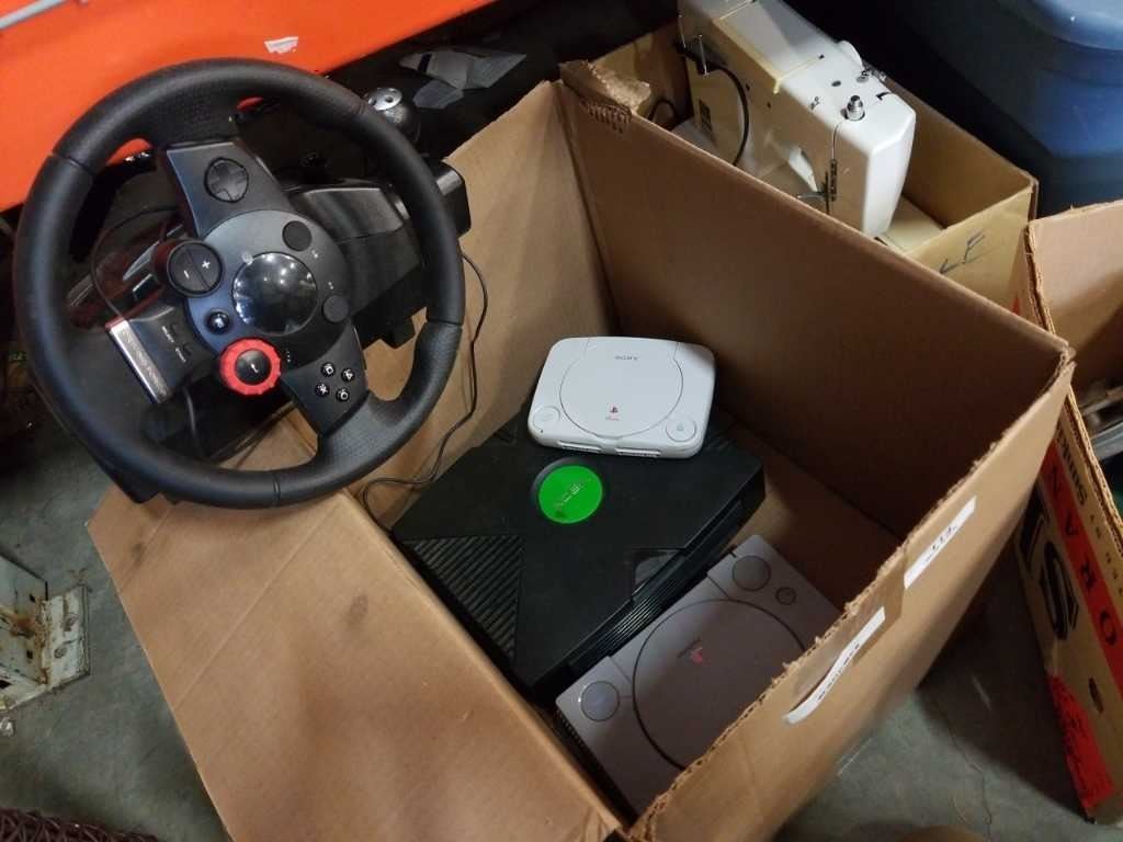 2 PLAYSTATIONS, XBOX CONSOLE AND LOGITECH STEERING WHEEL