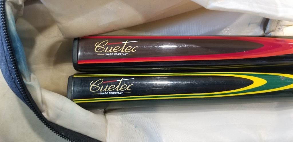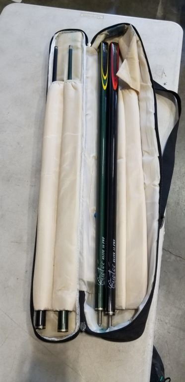 2 POOL CUES IN CASE, 2PC UNITS, ONE NEEDS TIP TO BE REATTACHED
