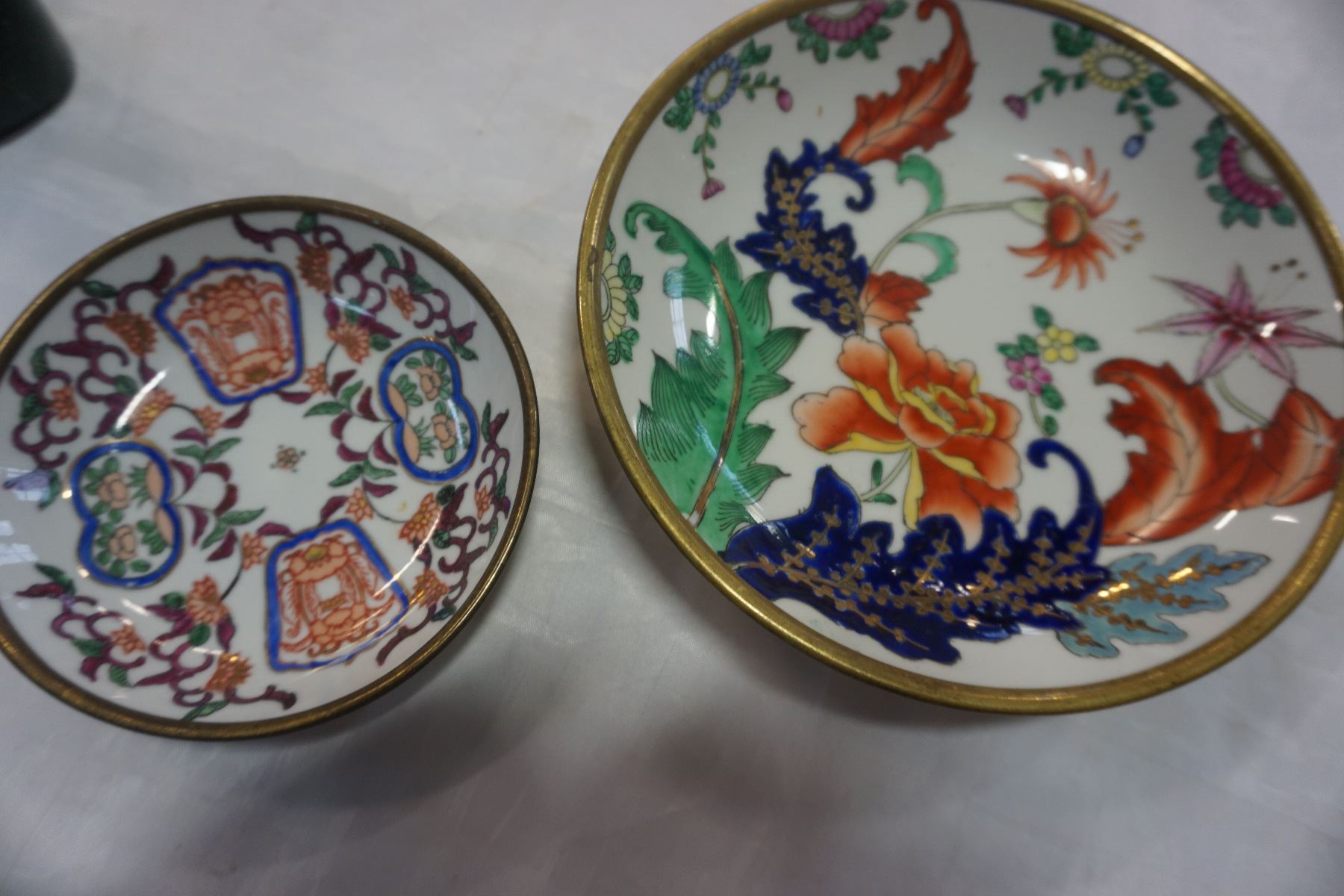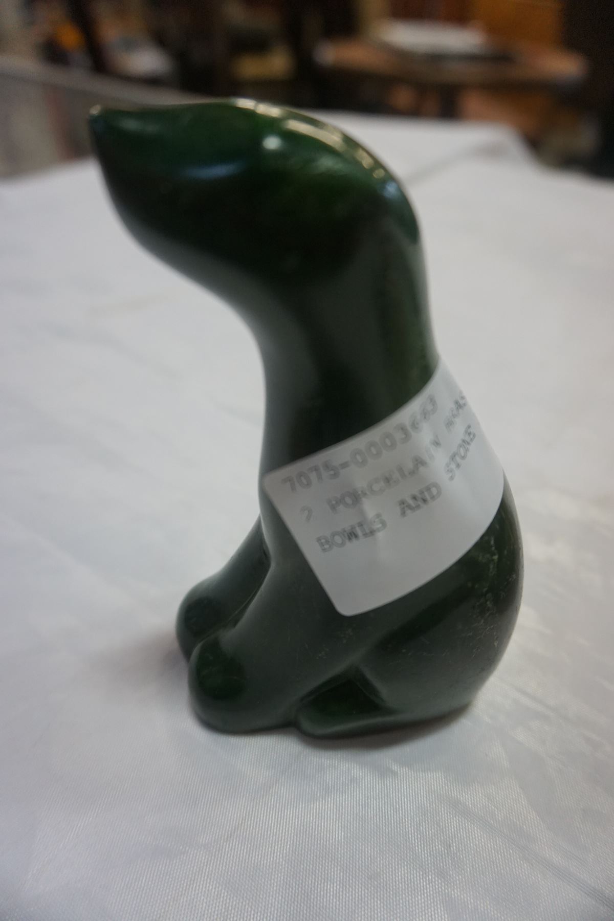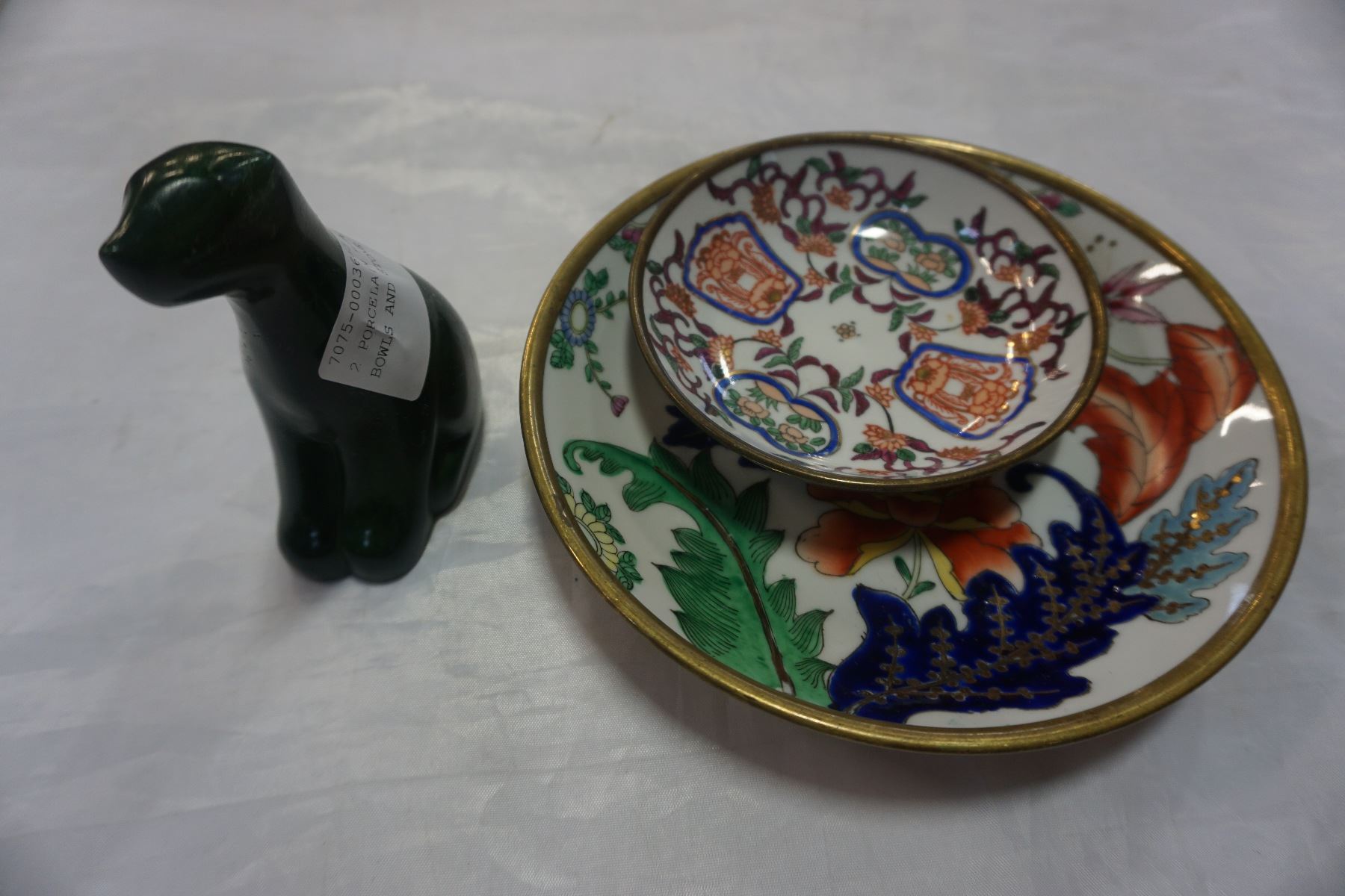 2 PORCELAIN BRASS EASTERN BOWLS AND STONE BEAR