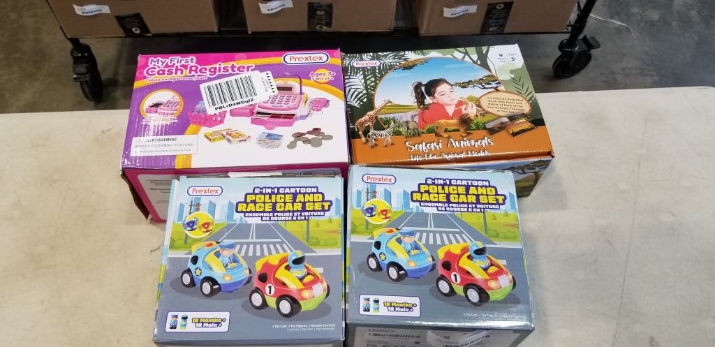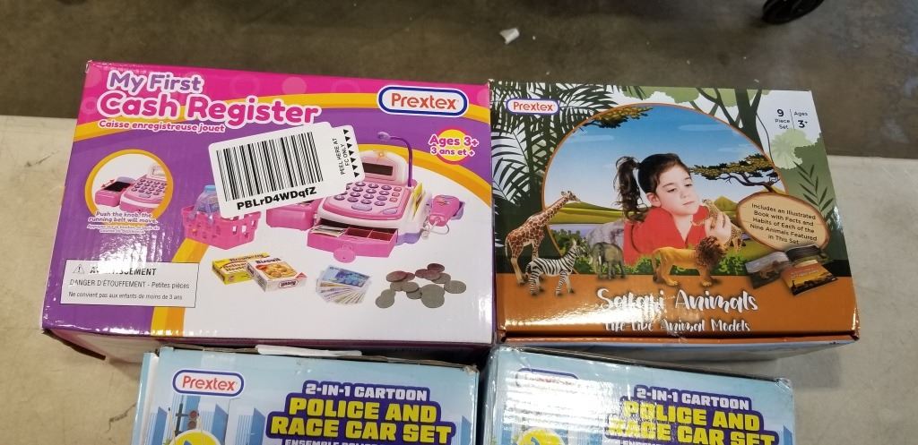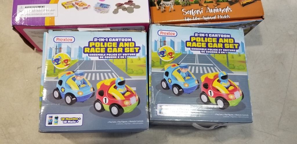 2 PREXTEX 2 IN 1 CARTOON POLICE AND RACE CAR SETS, MY FIRST CASH REGISTER AND SAFARI ANIMALS