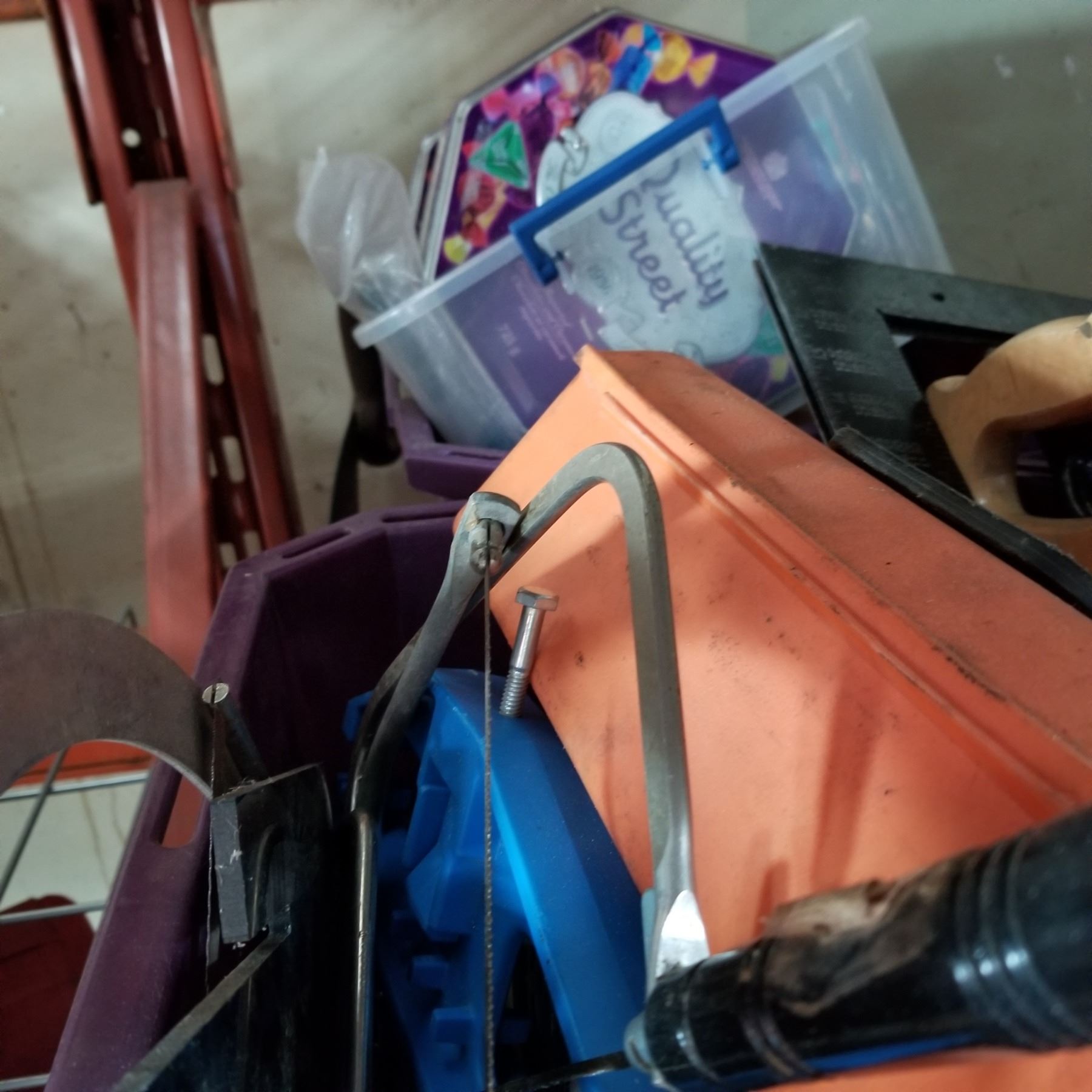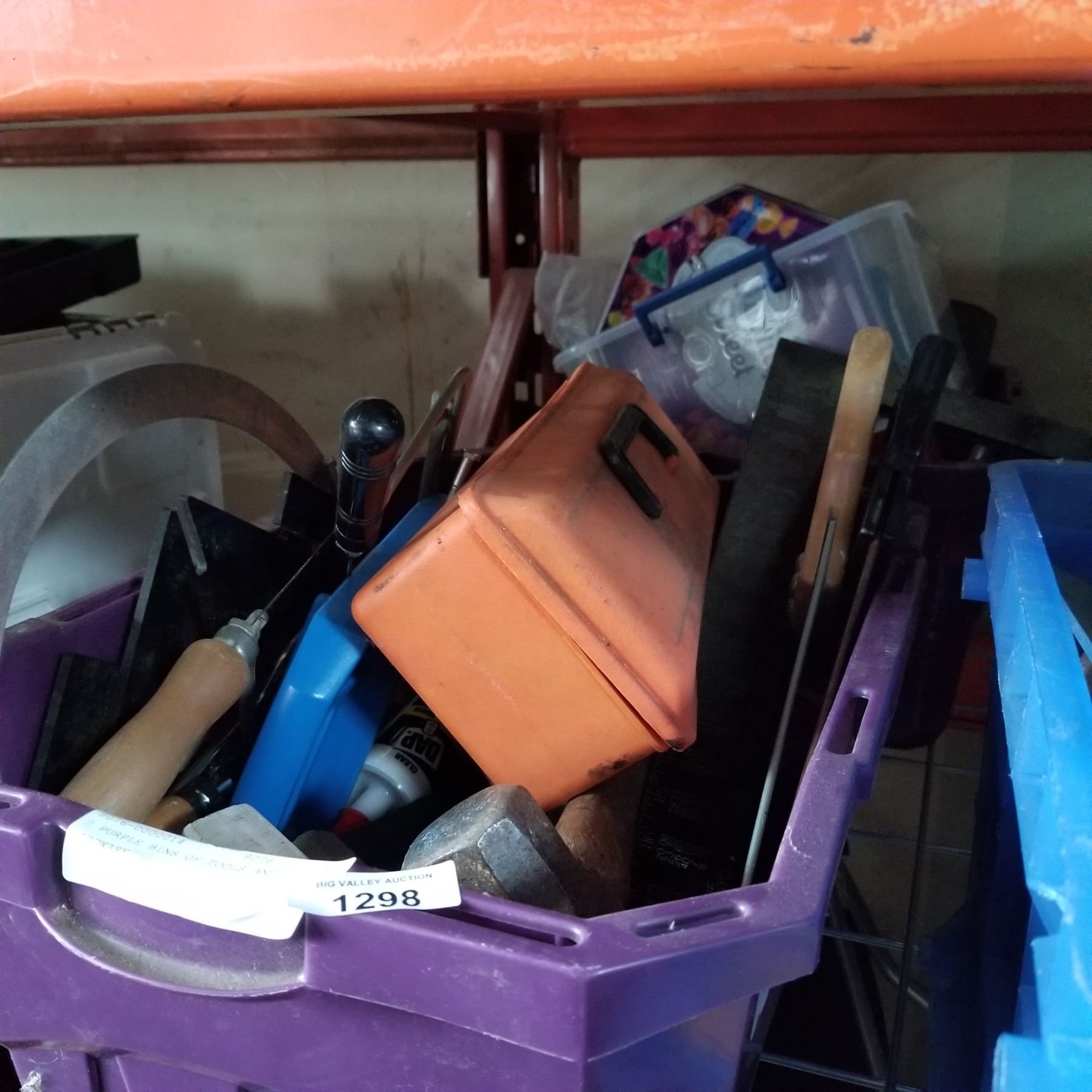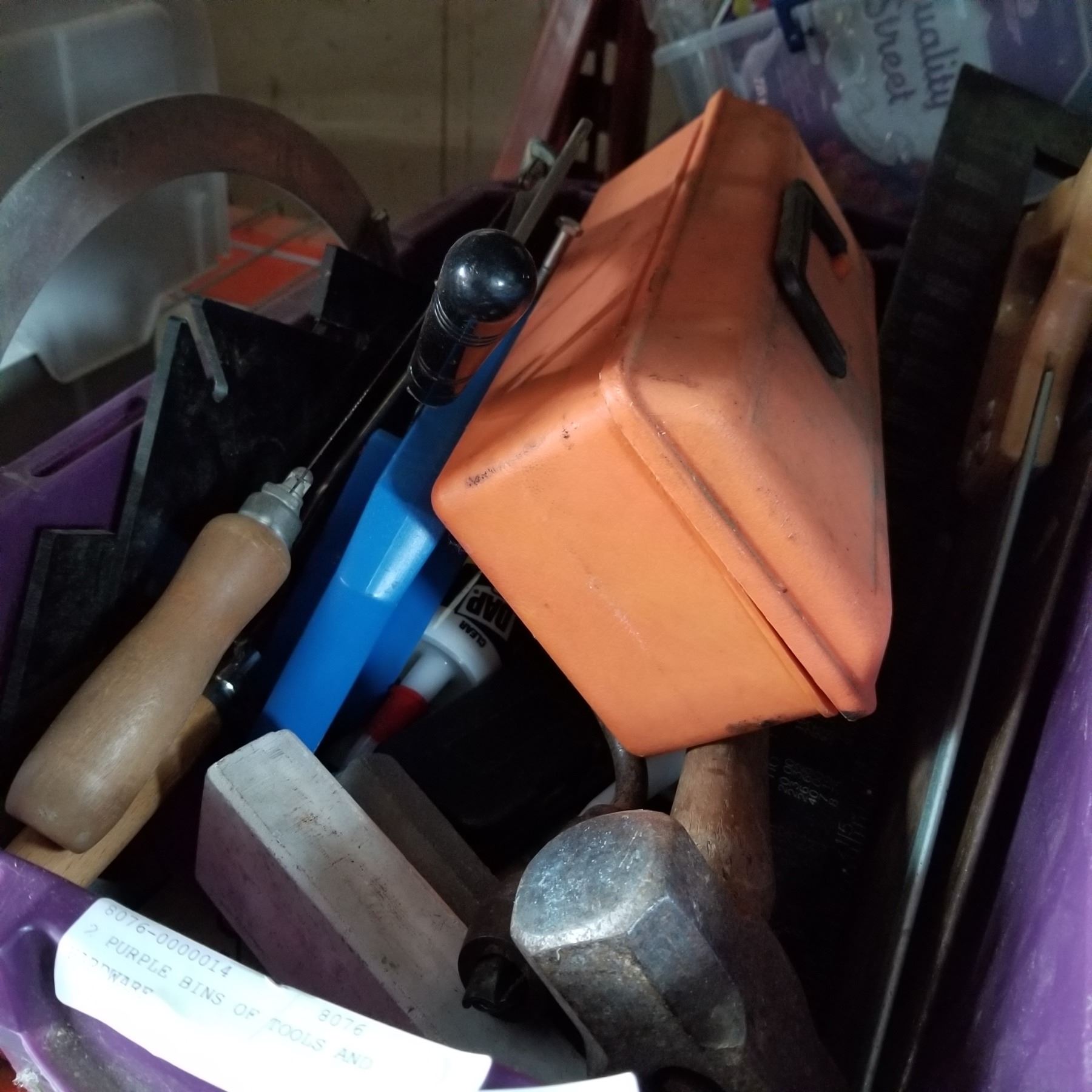 2 PURPLE BINS OF TOOLS AND HARDWARE