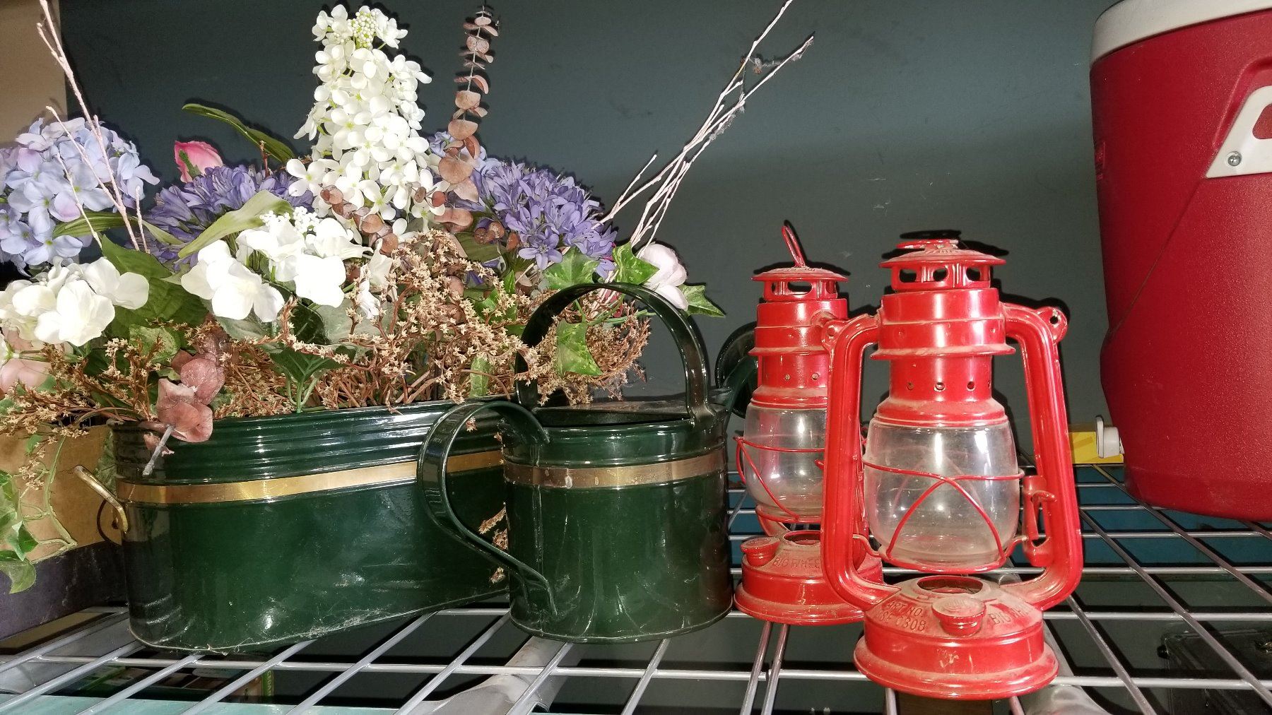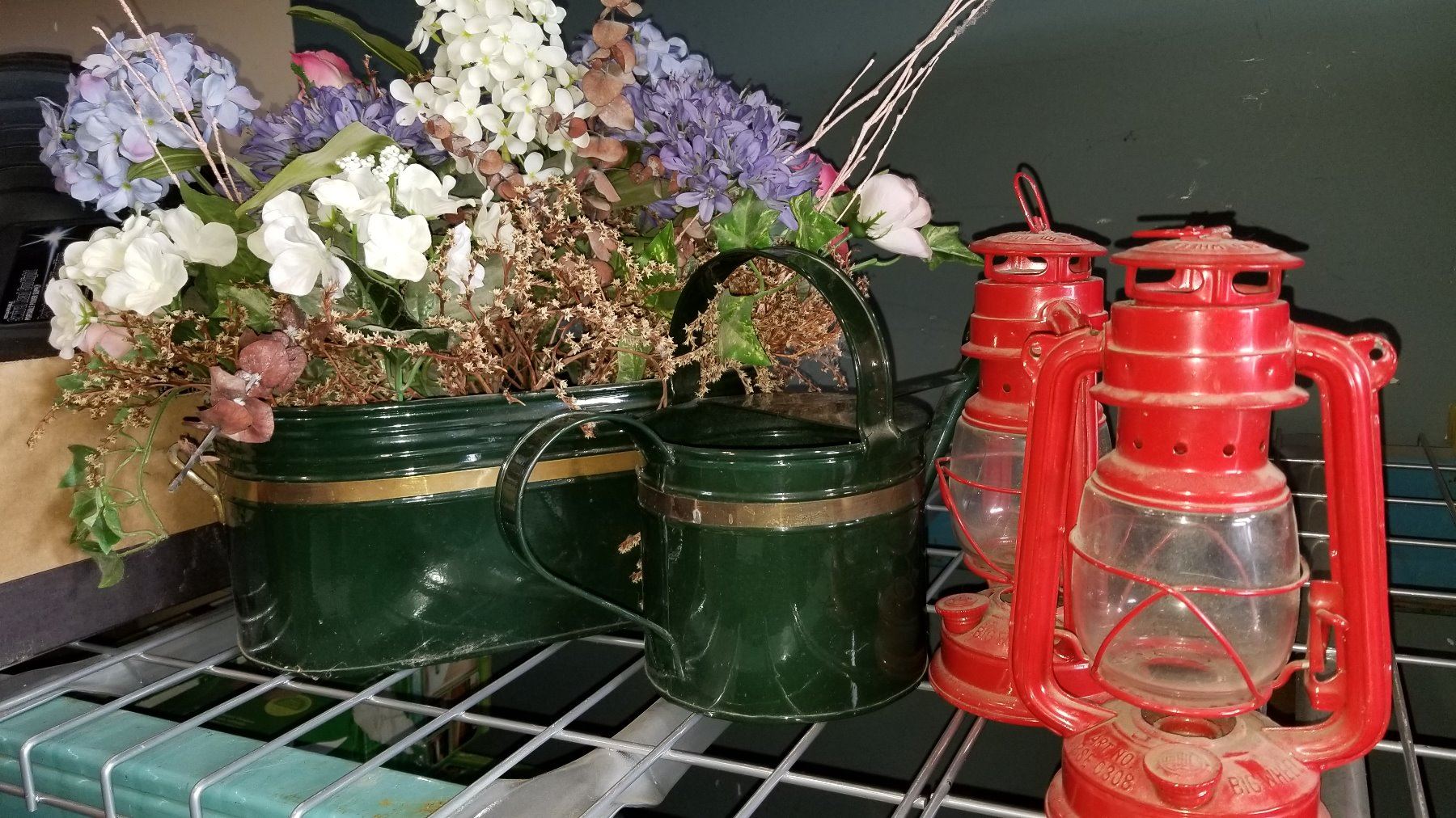 2 RED BIG WHEEL LANTERNS W/ FLOWER ARRANGEMENT IN BIN AND WATERING CAN