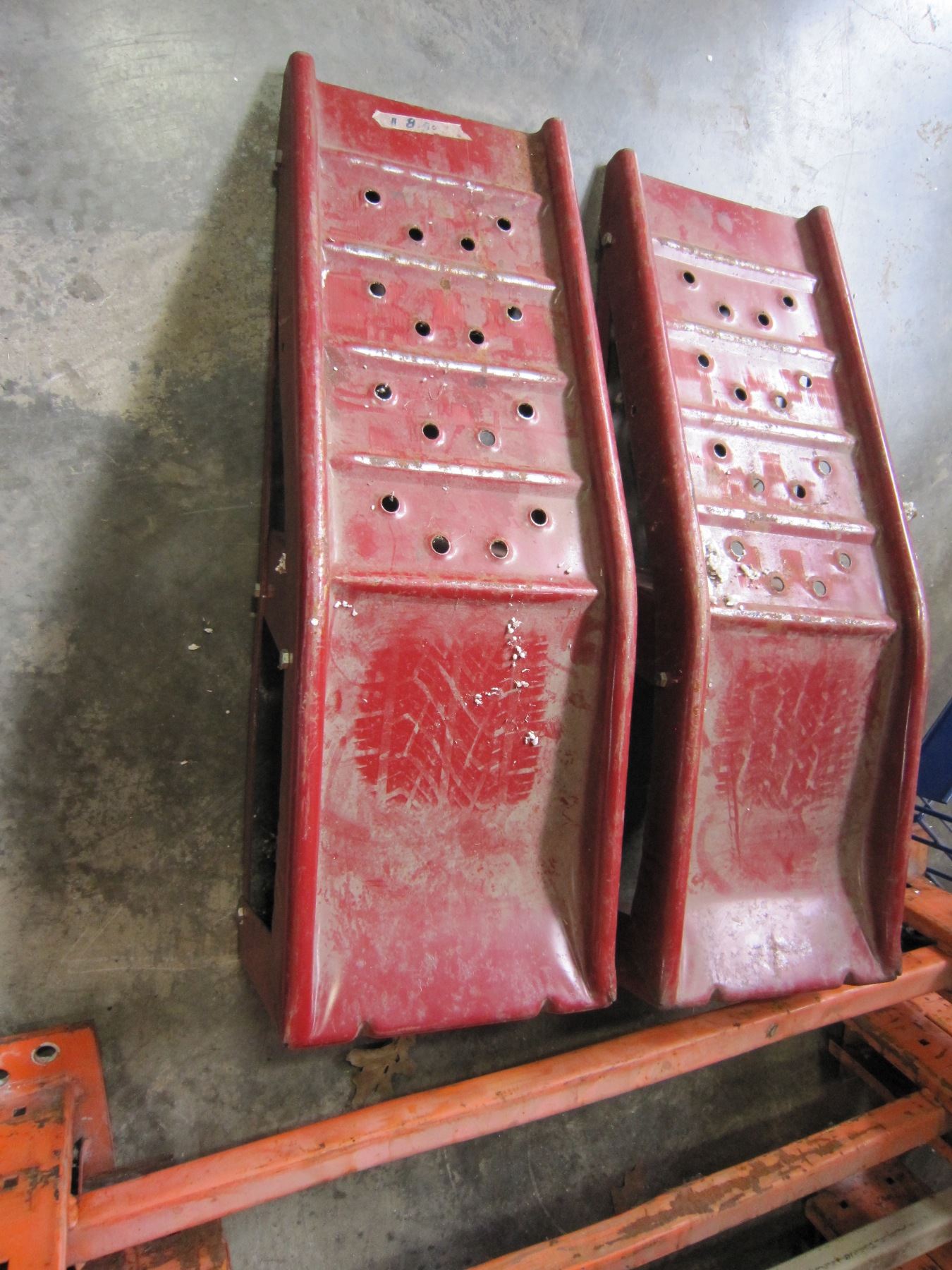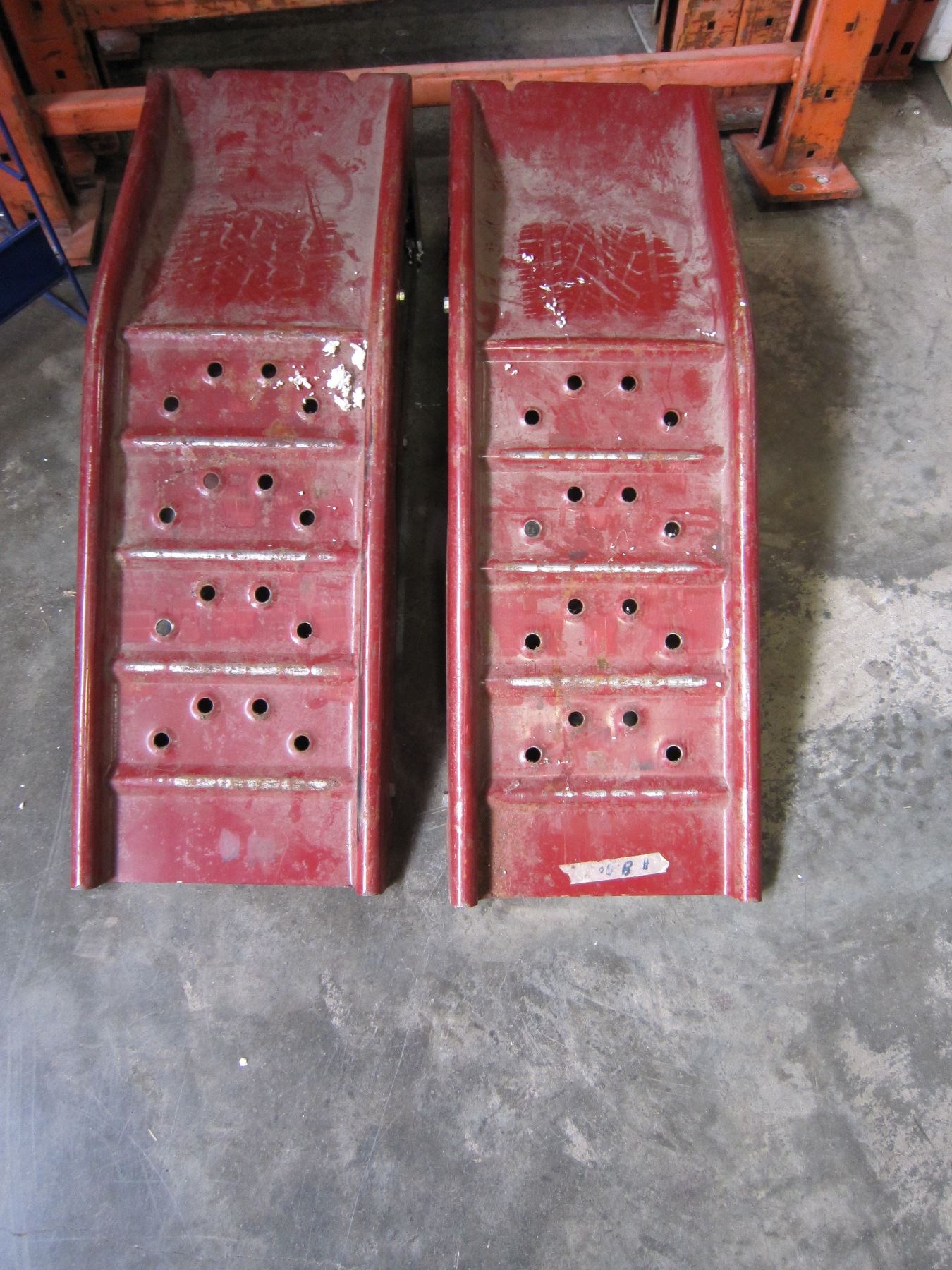 2 RED METAL CAR RAMPS , AND LOAD BAR
