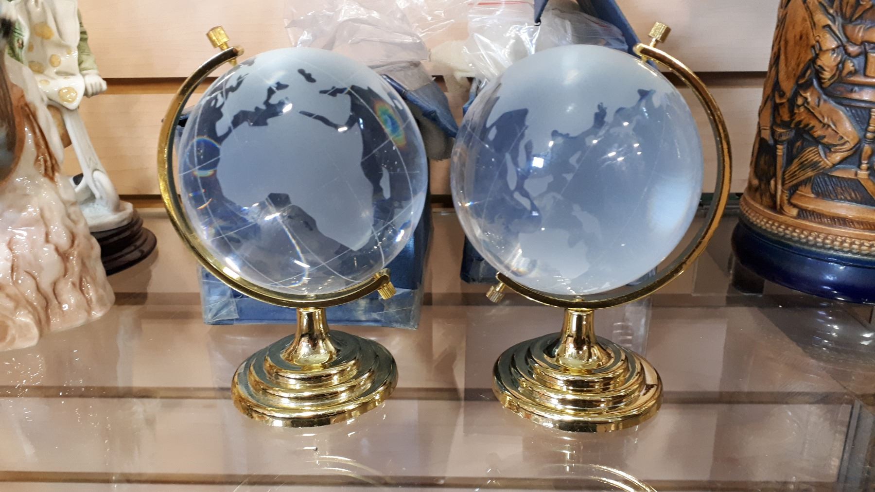 2 REVOLVING SOLID WORLD GLASS GLOBES ON STANDS