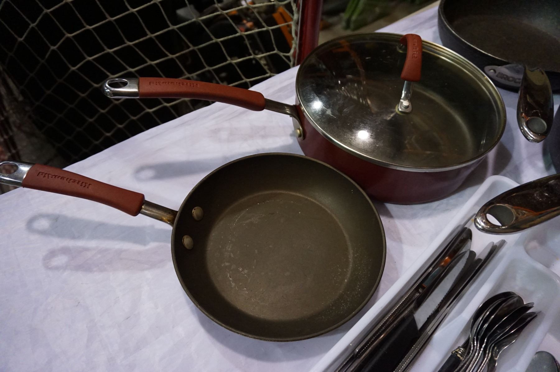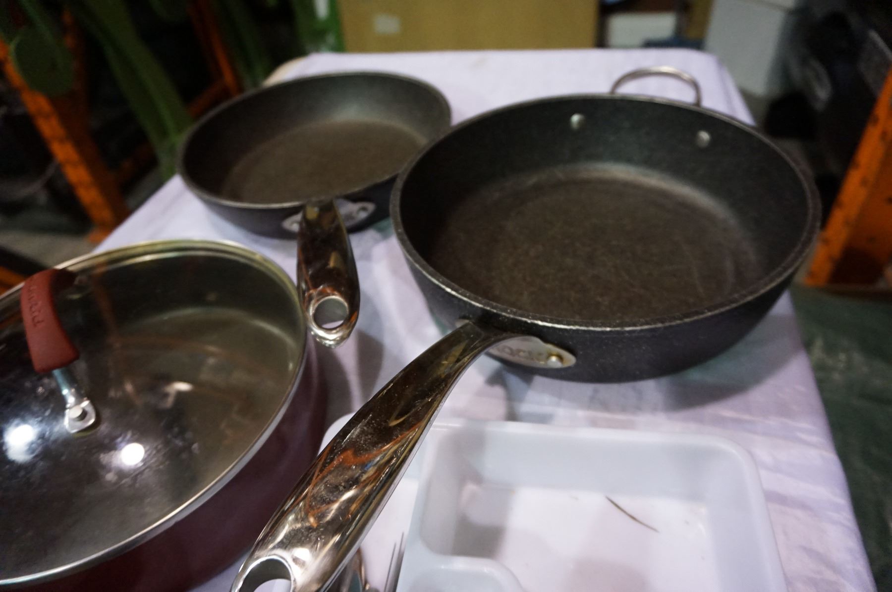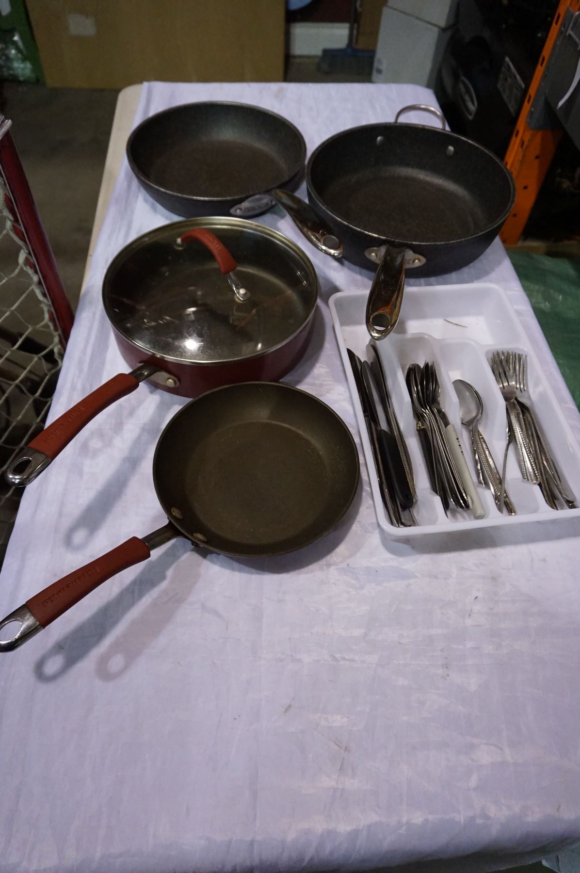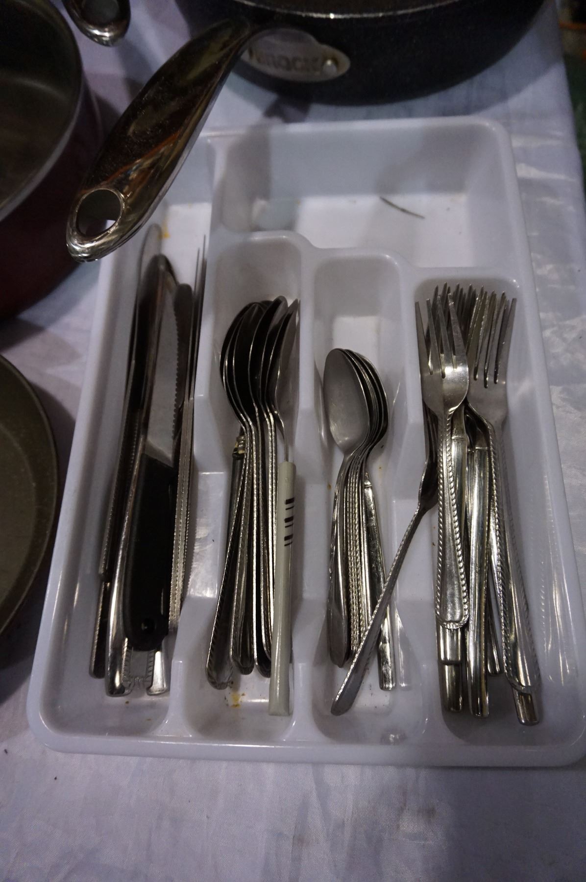 2 ROCK PANS, KITCHENAID PANS AND TRAY OF CUTLERY