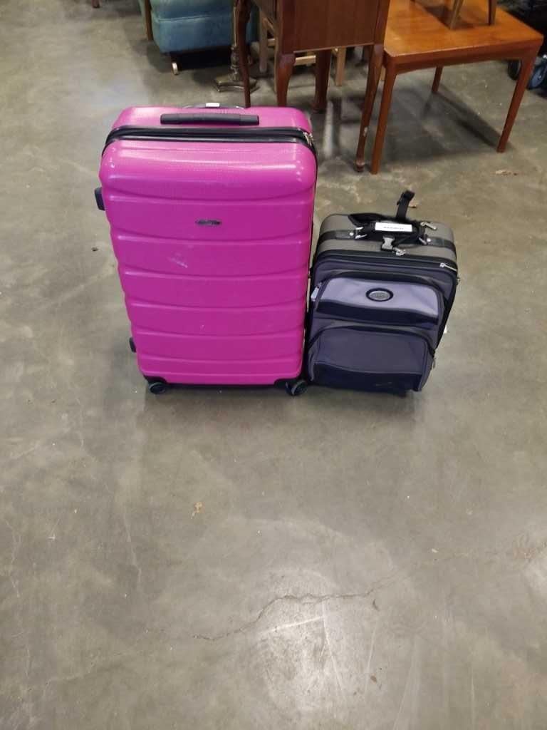2 ROLLING LUGGAGE BAGS WITH CONTENTS - PINK HARD CASE AND GREY