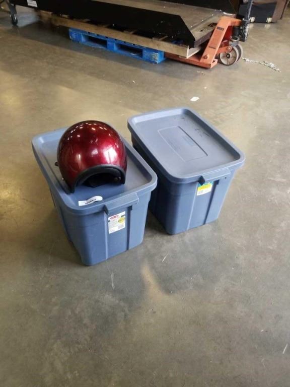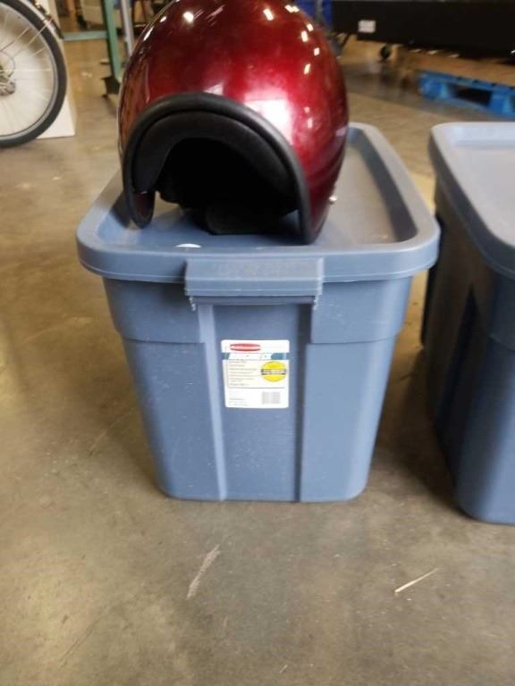 2 RUBBERMAID ROUGHNECK STORAGE TOTES AND ESCOOTER HELMET