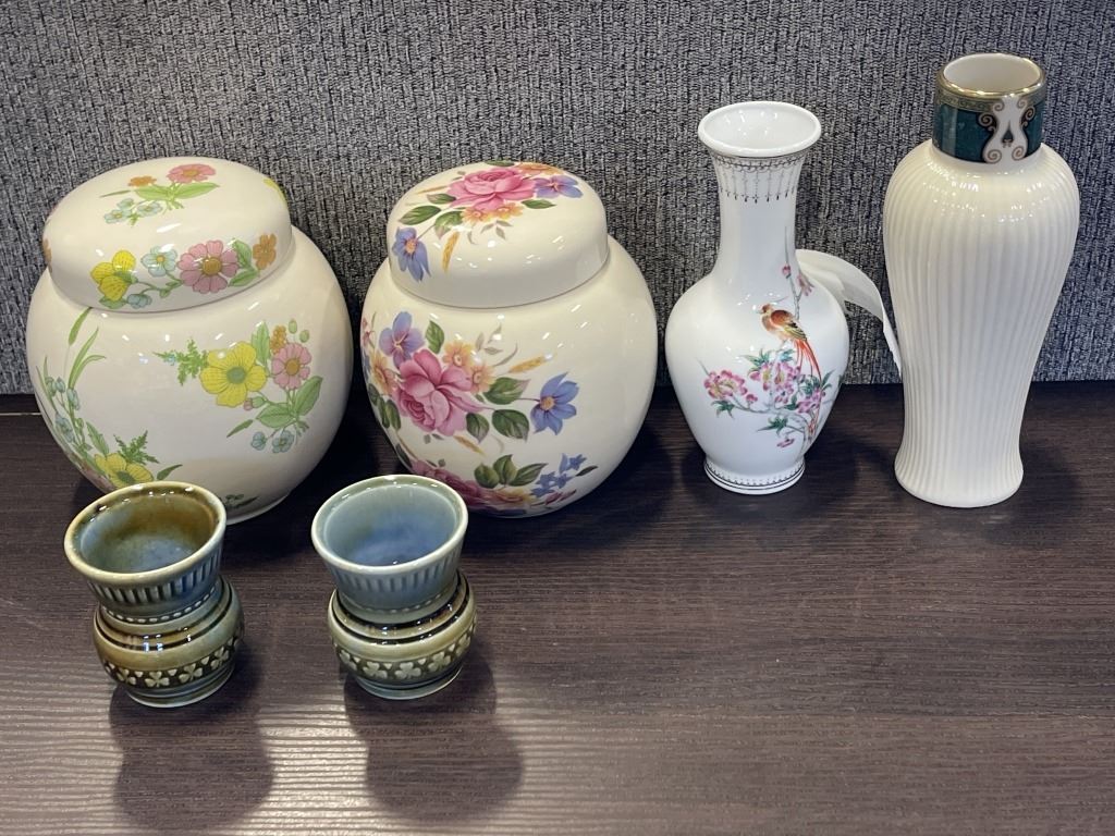 2 SADLER LIDDED JARS, WADE IRISH MINIATURE VASES, LENOX AND CHINESE VASE