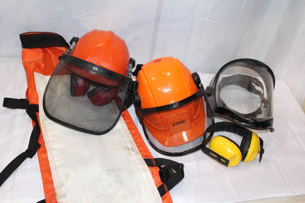 2 SAFETY HARDHATS WITH VISORS, AND EAR PROTECTION, FACE SHIELD, AND PROTECTIVE PANTS