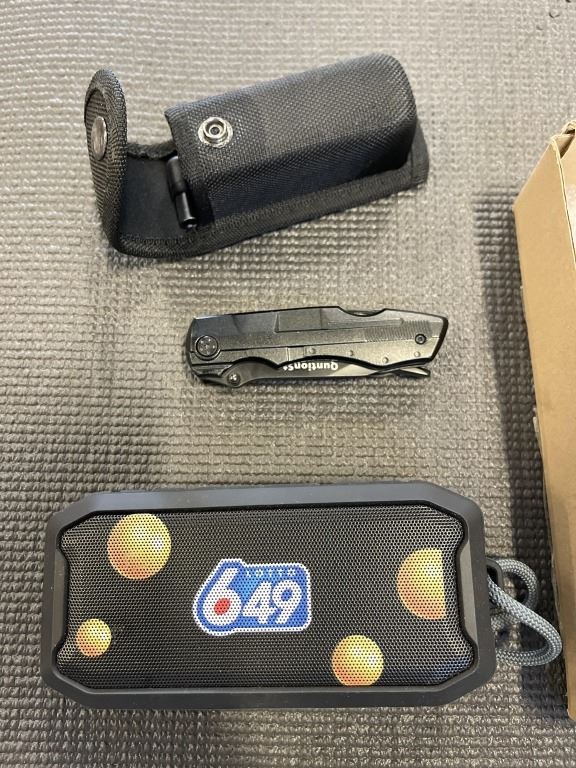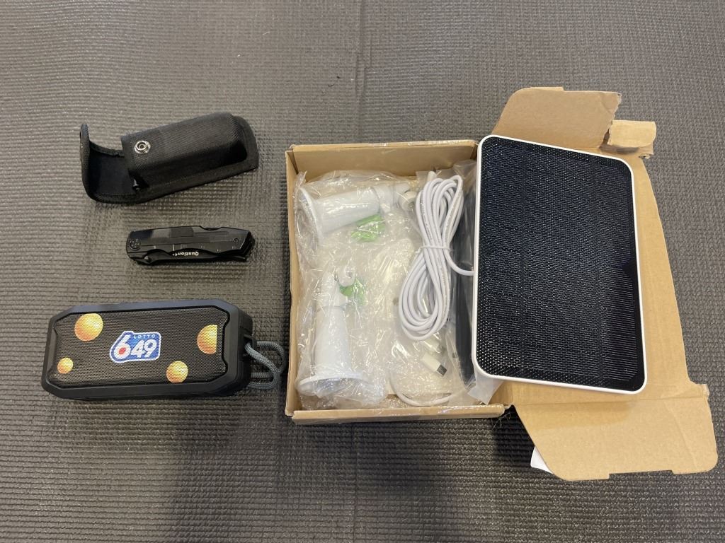 2 SECURITY SOLAR PANEL HOLDERS, BLUE TOOTH SPEAKER, AND MULTI TOOL