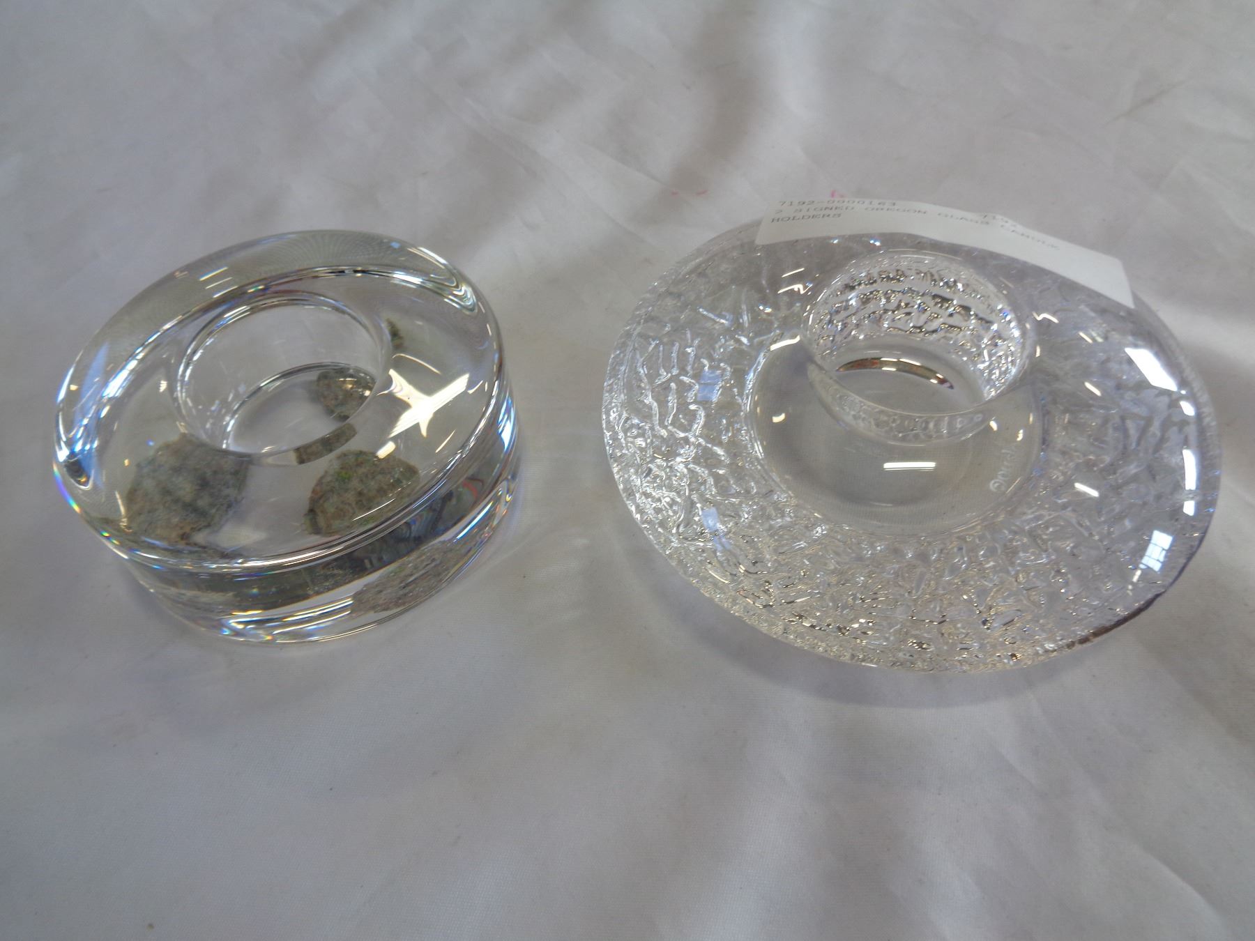 2 SIGNED OREGON GLASS CANDLE HOLDERS
