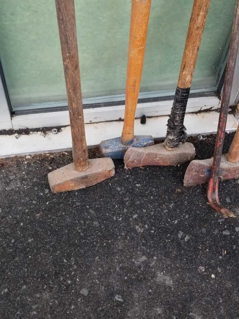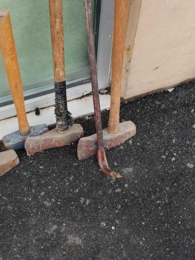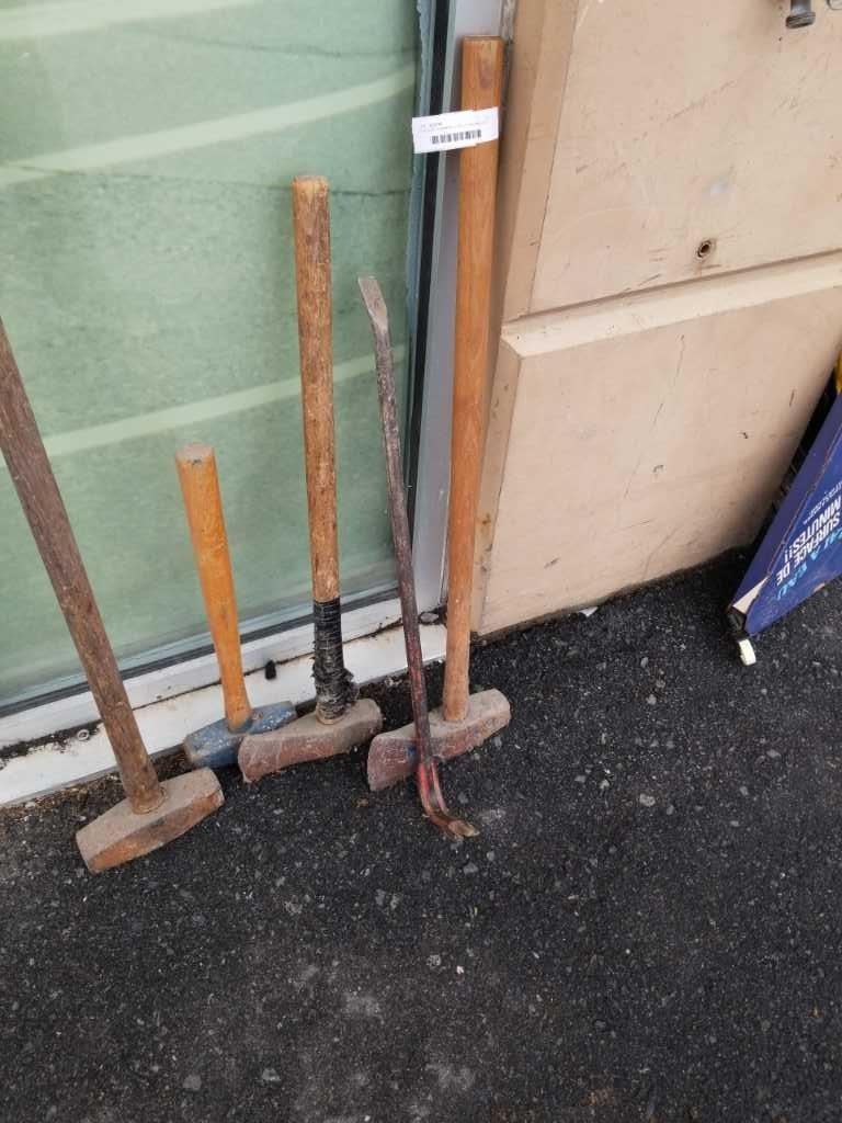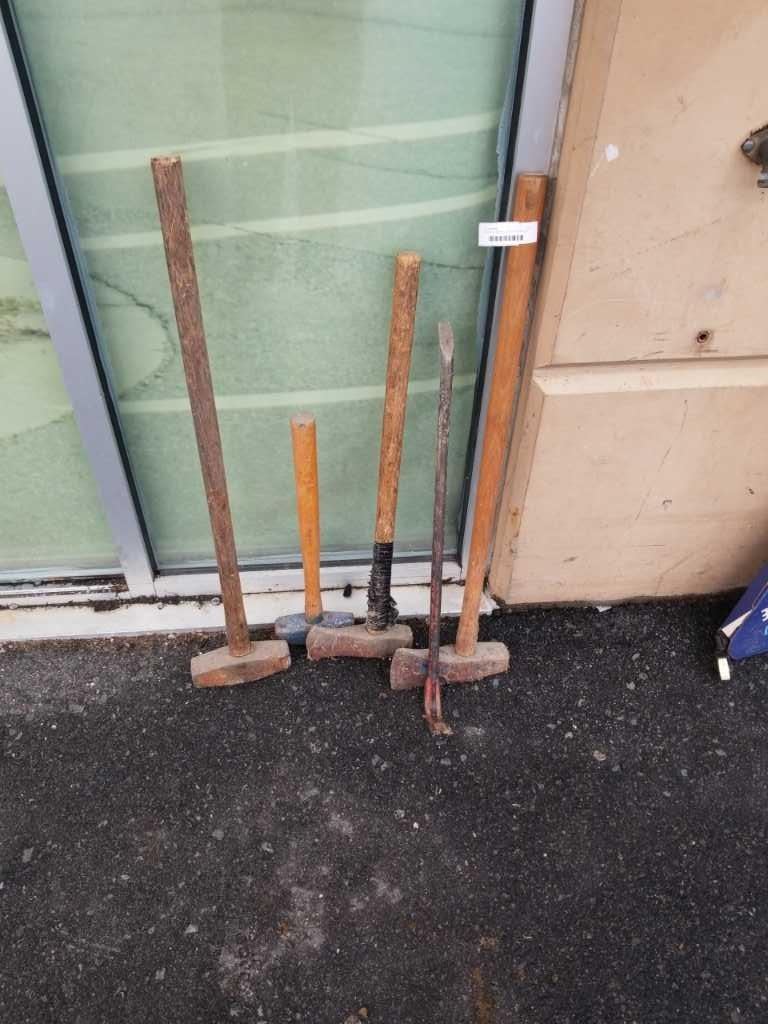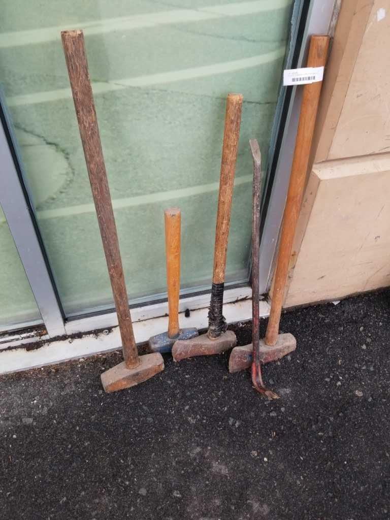 2 SLEDGE HAMMERS, 2 SPLITTING MAULS AND CROWBAR