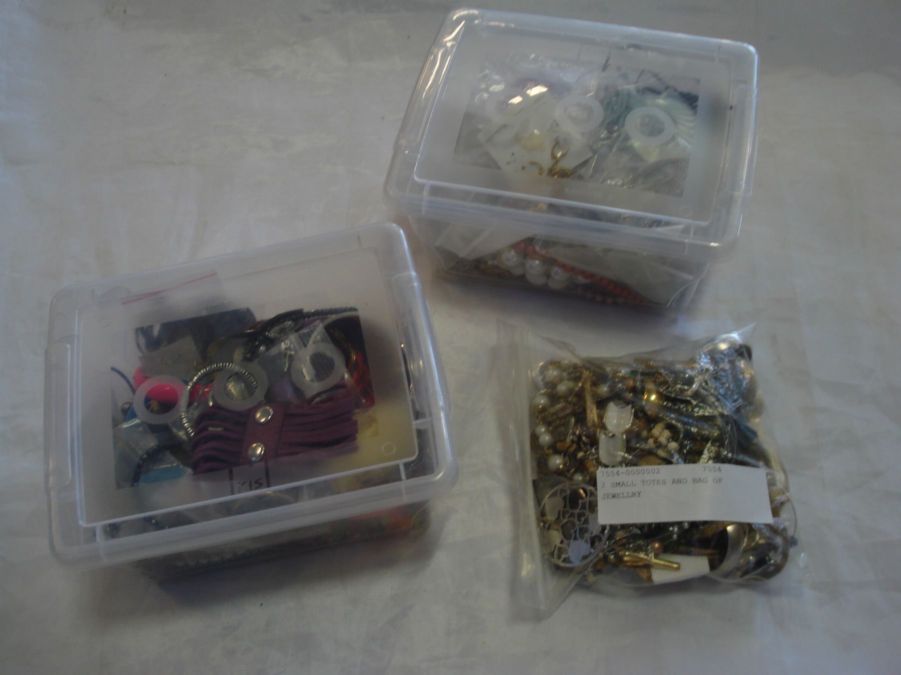 2 SMALL TOTES AND BAG OF JEWELLRY