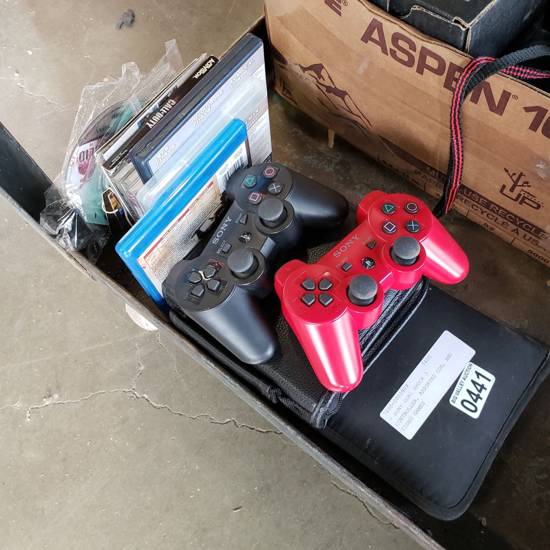 2 SONY DUAL SHOCK 3 CONTROLLER, ASSORTED CDS, AND VIDEO GAMES
