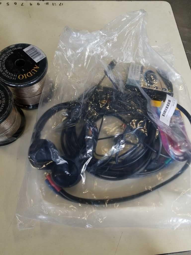 2 SPOOLS 14 GAUGE STEREO CABLE, WIRELESS HEADPHONES, WIRELESS CHARGING PAD, FM RADIO AND A/V CABLES